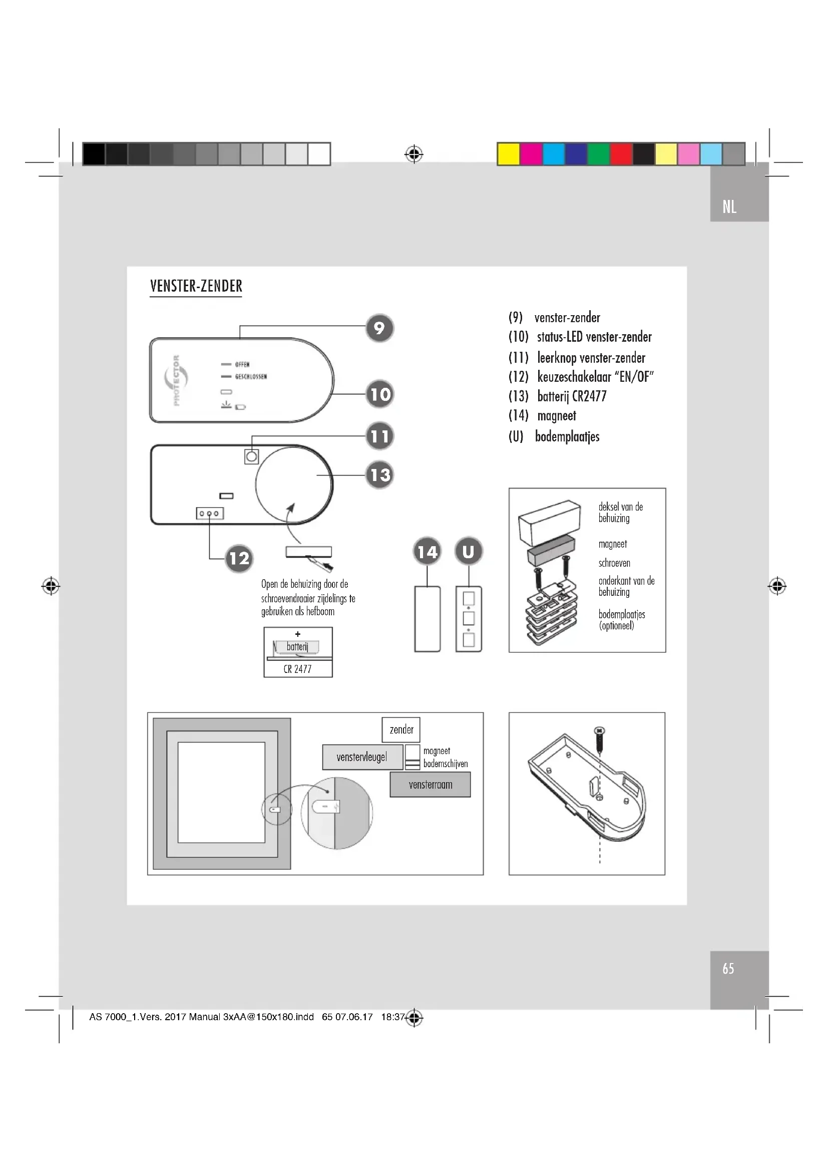 AS 7000_1.Vers. 2017 Manual 3xAA@150x180.indd 72 07.06.17 18:37• Het contact moet op de bovenste of zijdelingse vensterramen en -vleugels zo gemonteerd worden dat bij gesloten venster de afstand tussen de beide behuizingsonderdelen kleiner is dan 6 mm! Om dit aan te passen gebruikt u de meegeleverde bodemplaatjes (U).