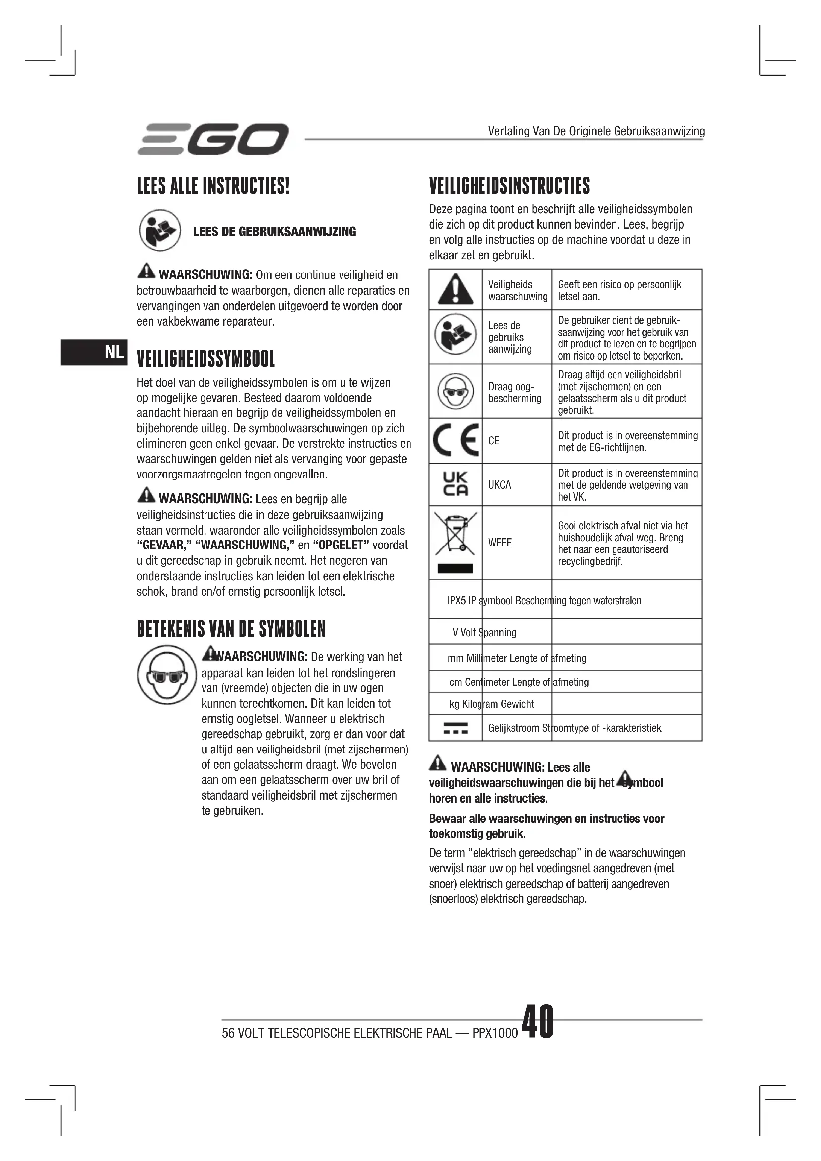 WAARSCHUWING: De werking van het apparaat kan leiden tot het rondslingeren van (vreemde) objecten die in uw ogen kunnen terechtkomen. Dit kan leiden tot ernstig oogletsel. Wanneer u elektrisch gereedschap gebruikt, zorg er dan voor dat u altijd een veiligheidsbril (met zijschermen) of een gelaatsscherm draagt. We bevelen aan om een gelaatsscherm over uw bril of standaard veiligheidsbril met zijschermen te gebruiken. VEILIGHEIDSINSTRUCTIES Deze pagina toont en beschrijft alle veiligheidssymbolen die zich op dit product kunnen bevinden. Lees, begrijp en volg alle instructies op de machine voordat u deze in elkaar zet en gebruikt. Veiligheids waarschuwingGeeft een risico op persoonlijk letsel aan.Lees de gebruiks aanwijzingDe gebruiker dient de gebruik-saanwijzing voor het gebruik van dit product te lezen en te begrijpen om risico op letsel te beperken.Draag oog-beschermingDraag altijd een veiligheidsbril (met zijschermen) en een gelaatsscherm als u dit product gebruikt. Dit product is in overeenstemming met de EG-richtlijnen. UKCA Dit product is in overeenstemming met de geldende wetgeving van het VK. WEEE Gooi elektrisch afval niet via het huishoudelijk afval weg. Breng het naar een geautoriseerd recyclingbedrijf.IPX5 IP symbool Bescherming tegen waterstralenV Volt Spanningmm Millimeter Lengte of afmetingcm Centimeter Lengte of afmetingkg Kilogram GewichtGelijkstroom Stroomtype of -karakteristiek WAARSCHUWING: Lees alle veiligheidswaarschuwingen die bij het symbool horen en alle instructies. Bewaar alle waarschuwingen en instructies voor toekomstig gebruik. De term “elektrisch gereedschap” in de waarschuwingen verwijst naar uw op het voedingsnet aangedreven (met snoer) elektrisch gereedschap of batterij aangedreven (snoerloos) elektrisch gereedschap. Vertaling Van De Originele Gebruiksaanwijzing56 VOLT TELESCOPISCHE ELEKTRISCHE PAAL — PPX1000 41