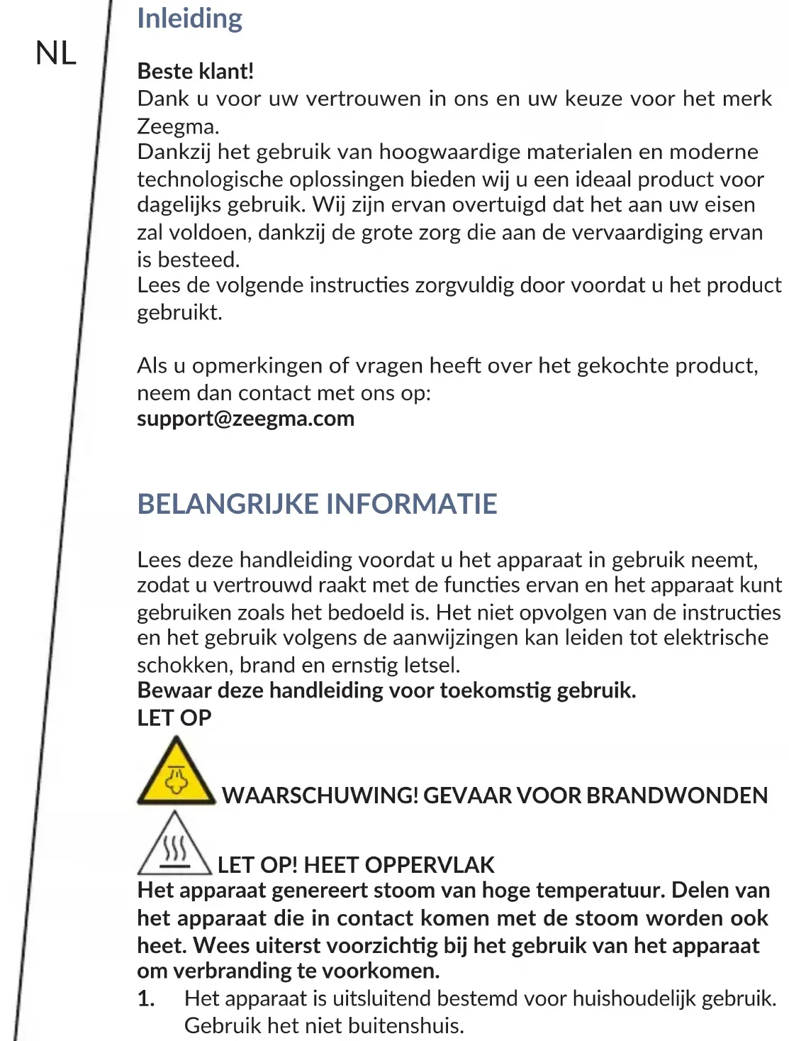 un paño suave y seco. Las fotos solo enen carácter ilustravo, el aspecto real de los productos puede diferir de los presentados en las fotos.NL Inleiding Beste klant! Dank u voor uw vertrouwen in ons en uw keuze voor het merk Zeegma. Dankzij het gebruik van hoogwaardige materialen en moderne technologische oplossingen bieden wij u een ideaal product voor dagelijks gebruik. Wij zijn ervan overtuigd dat het aan uw eisen zal voldoen, dankzij de grote zorg die aan de vervaardiging ervan is besteed. Lees de volgende instruces zorgvuldig door voordat u het product gebruikt. Als u opmerkingen of vragen hee over het gekochte product, neem dan contact met ons op: support@zeegma.com BELANGRIJKE INFORMATIE Lees deze handleiding voordat u het apparaat in gebruik neemt, zodat u vertrouwd raakt met de funces ervan en het apparaat kunt gebruiken zoals het bedoeld is. Het niet opvolgen van de instruces en het gebruik volgens de aanwijzingen kan leiden tot elektrische schokken, brand en ernsg letsel. Bewaar deze handleiding voor toekomsg gebruik. LET OP
