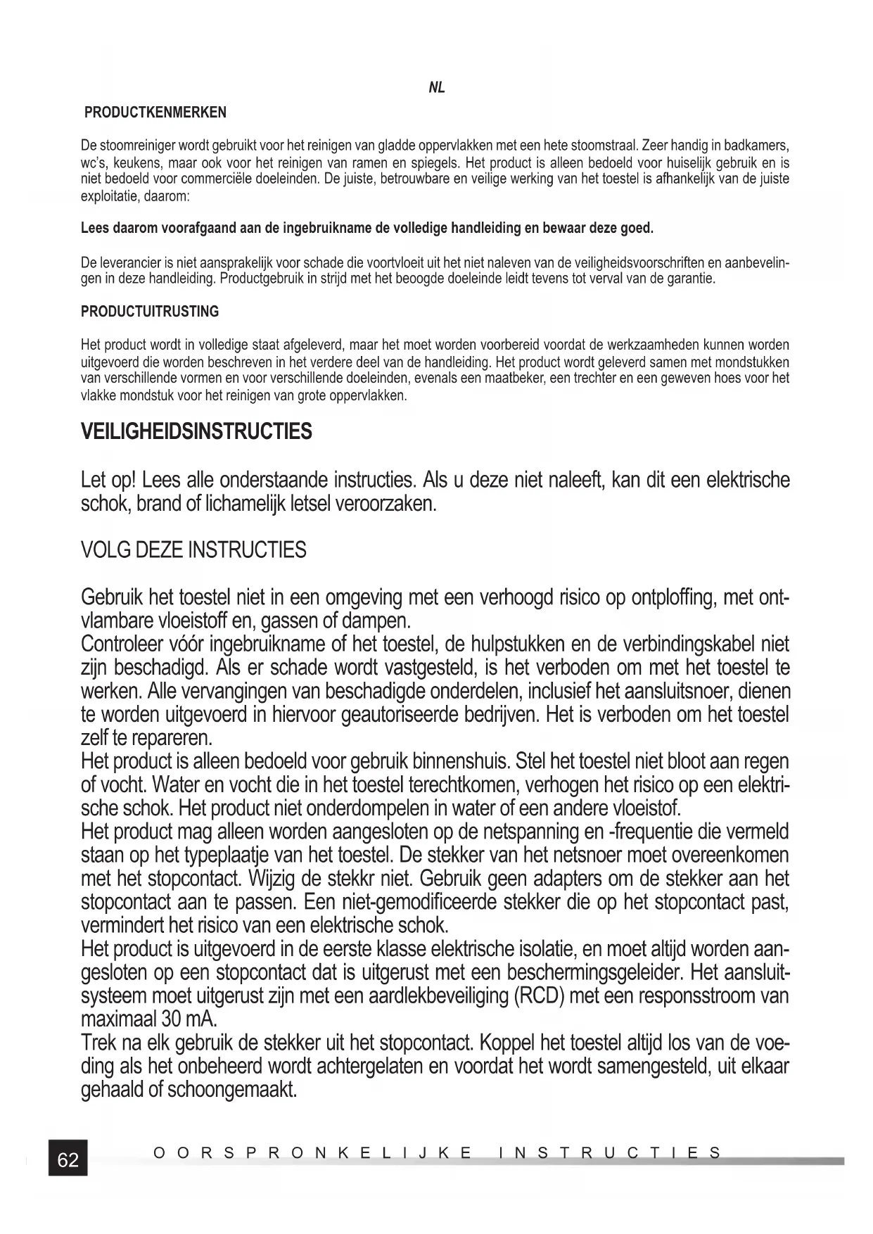 PRODUCTKENMERKEN De stoomreiniger wordt gebruikt voor het reinigen van gladde oppervlakken met een hete stoomstraal. Zeer handig in badkamers, wc’s, keukens, maar ook voor het reinigen van ramen en spiegels. Het product is alleen bedoeld voor huiselijk gebruik en is niet bedoeld voor commerciële doeleinden. De juiste, betrouwbare en veilige werking van het toestel is afhankelijk van de juiste exploitatie, daarom: Lees daarom voorafgaand aan de ingebruikname de volledige handleiding en bewaar deze goed. De leverancier is niet aansprakelijk voor schade die voortvloeit uit het niet naleven van de veiligheidsvoorschriften en aanbevelin- gen in deze handleiding. Productgebruik in strijd met het beoogde doeleinde leidt tevens tot verval van de garantie. PRODUCTUITRUSTING Het product wordt in volledige staat afgeleverd, maar het moet worden voorbereid voordat de werkzaamheden kunnen worden uitgevoerd die worden beschreven in het verdere deel van de handleiding. Het product wordt geleverd samen met mondstukken van verschillende vormen en voor verschillende doeleinden, evenals een maatbeker, een trechter en een geweven hoes voor het vlakke mondstuk voor het reinigen van grote oppervlakken. VEILIGHEIDSINSTRUCTIES Let op! Lees alle onderstaande instructies. Als u deze niet naleeft, kan dit een elektrische schok, brand of lichamelijk letsel veroorzaken.