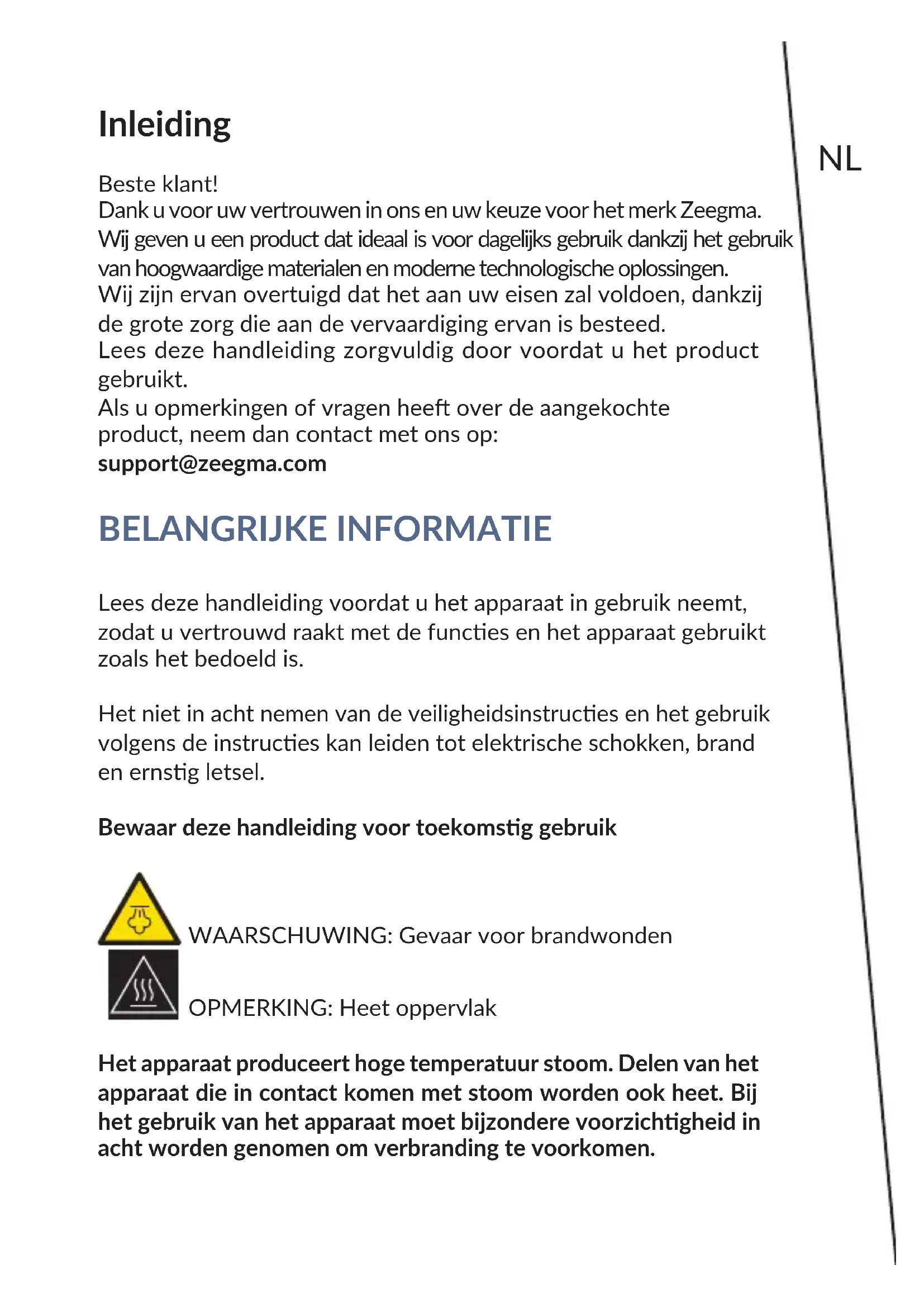 Mantén el disposivo en un lugar seco y fuera del alcance de los niños. El producto cumple los requisitos de las direcvas de la Unión Europea. De acuerdo con la Direcva 2012/19/UE, este producto está sujeto a recogida selecva. El producto no debe eliminarse con los residuos municipales, ya que puede suponer una amenaza para el medio ambiente y la salud humana. Por favor, entrega el producto que ya no vayas a ulizar a un centro de reciclaje de disposivos eléctricos y electrónicos. Las fotos y esquemas solo enen carácter ilustravo, el aspecto real de los productos puede diferir de los presentados en ellos.NL Inleiding Beste klant! Dank u voor uw vertrouwen in ons en uw keuze voor het merk Zeegma. Wij geven u een product dat ideaal is voor dagelijks gebruik dankzij het gebruik van hoogwaardige materialen en moderne technologische oplossingen. Wij zijn ervan overtuigd dat het aan uw eisen zal voldoen, dankzij de grote zorg die aan de vervaardiging ervan is besteed. Lees deze handleiding zorgvuldig door voordat u het product gebruikt. Als u opmerkingen of vragen hee over de aangekochte product, neem dan contact met ons op: support@zeegma.com BELANGRIJKE INFORMATIE Lees deze handleiding voordat u het apparaat in gebruik neemt, zodat u vertrouwd raakt met de funces en het apparaat gebruikt zoals het bedoeld is. Het niet in acht nemen van de veiligheidsinstruces en het gebruik volgens de instruces kan leiden tot elektrische schokken, brand en ernsg letsel. Bewaar deze handleiding voor toekomsg gebruik WAARSCHUWING: Gevaar voor brandwonden OPMERKING: Heet oppervlak Het apparaat produceert hoge temperatuur stoom. Delen van het apparaat die in contact komen met stoom worden ook heet. Bij het gebruik van het apparaat moet bijzondere voorzichgheid in acht worden genomen om verbranding te voorkomen.NL