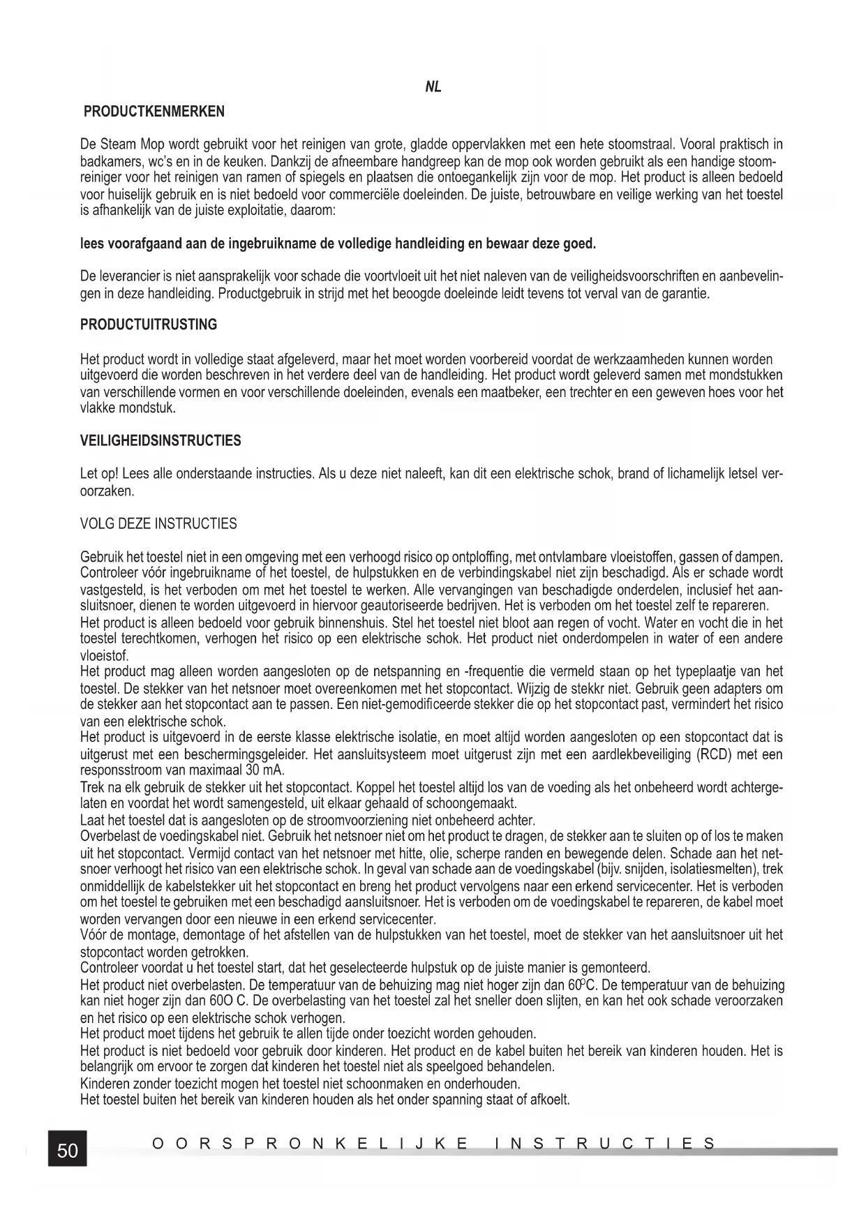 PRODUCTKENMERKEN De Steam Mop wordt gebruikt voor het reinigen van grote, gladde oppervlakken met een hete stoomstraal. Vooral praktisch in badkamers, wc’s en in de keuken. Dankzij de afneembare handgreep kan de mop ook worden gebruikt als een handige stoom- reiniger voor het reinigen van ramen of spiegels en plaatsen die ontoegankelijk zijn voor de mop. Het product is alleen bedoeld voor huiselijk gebruik en is niet bedoeld voor commerciële doeleinden. De juiste, betrouwbare en veilige werking van het toestel is afhankelijk van de juiste exploitatie, daarom: lees voorafgaand aan de ingebruikname de volledige handleiding en bewaar deze goed. De leverancier is niet aansprakelijk voor schade die voortvloeit uit het niet naleven van de veiligheidsvoorschriften en aanbevelin- gen in deze handleiding. Productgebruik in strijd met het beoogde doeleinde leidt tevens tot verval van de garantie. PRODUCTUITRUSTING Het product wordt in volledige staat afgeleverd, maar het moet worden voorbereid voordat de werkzaamheden kunnen worden uitgevoerd die worden beschreven in het verdere deel van de handleiding. Het product wordt geleverd samen met mondstukken van verschillende vormen en voor verschillende doeleinden, evenals een maatbeker, een trechter en een geweven hoes voor het vlakke mondstuk. VEILIGHEIDSINSTRUCTIES Let op! Lees alle onderstaande instructies. Als u deze niet naleeft, kan dit een elektrische schok, brand of lichamelijk letsel ver- oorzaken.
