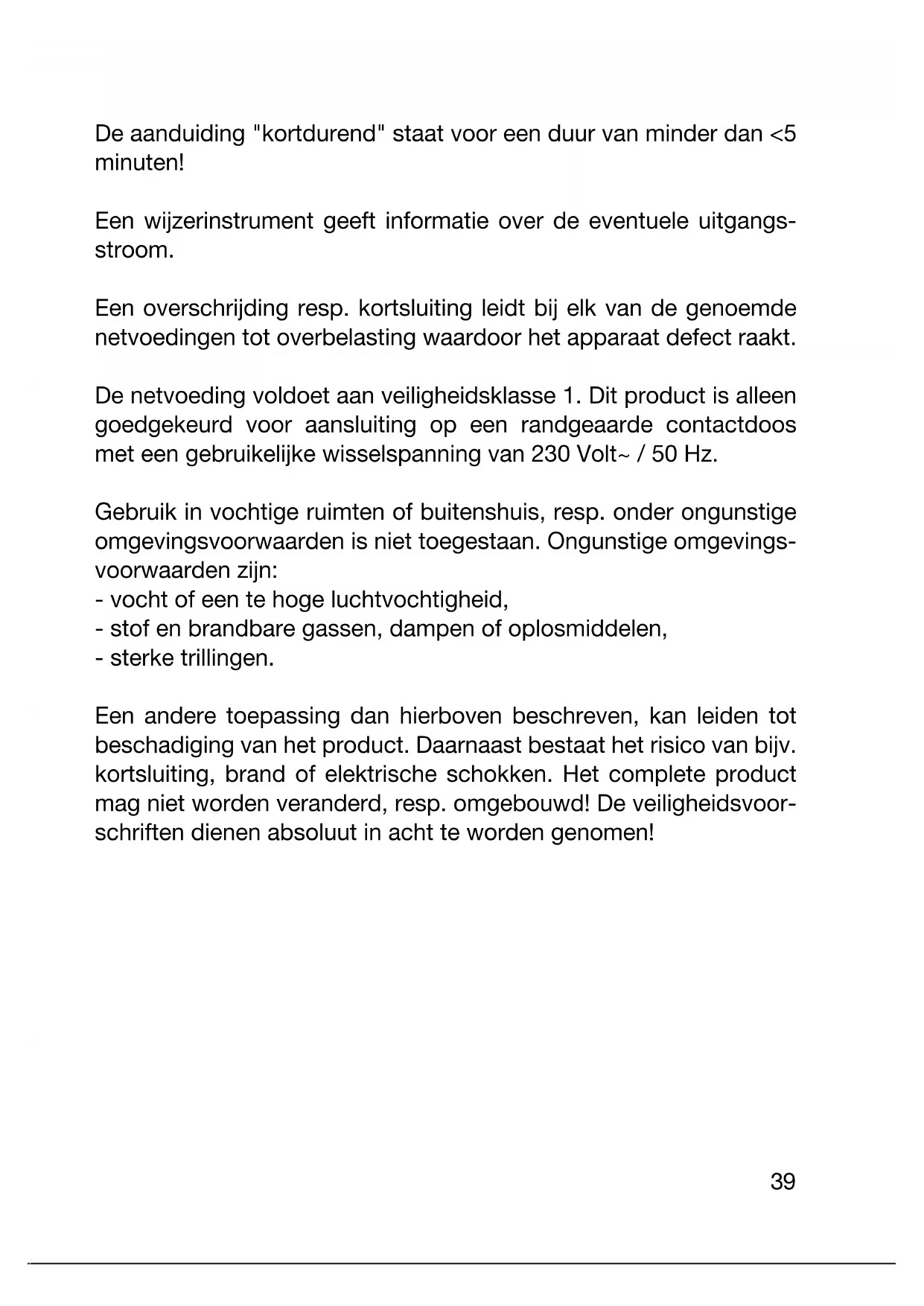 - Technische gegevens Voorgeschreven gebruik Deze gestabiliseerde netvoedingen met vaste spanning zijn geschikt voor het aansluiten en gebruiken van laagspanningsapparaten. Afhankelijk van het apparaat dat u heeft gekocht, dienen de volgen- de gegevens in acht te worden genomen. Model uitgangsspanning - max. uitgangsstroom FSP-1122 12 Volt DC 2A continu / kortdurend 4A FSP-1243 24 Volt DC 3A continu / kortdurend 5A FSP-1132 13,8 Volt DC 2A continu / kortdurend 4A FSP-1134 13,8 Volt DC 4A continu / kortdurend 6A FSP-1136 13,8 Volt DC 6A continu / kortdurend 8A FSP-1138 13,8 Volt DC 8A continu / kortdurend 10A FSP-11312 13,8 Volt DC 12A continu / kortdurend 15A FSP-11320 13,8 Volt DC 20A continu / kortdurend 22A FSP-11330 13,8 Volt DC 30A continu / kortdurend 32A 38De aanduiding "kortdurend" staat voor een duur van minder dan <5 minuten! Een wijzerinstrument geeft informatie over de eventuele uitgangs- stroom. Een overschrijding resp. kortsluiting leidt bij elk van de genoemde netvoedingen tot overbelasting waardoor het apparaat defect raakt. De netvoeding voldoet aan veiligheidsklasse 1. Dit product is alleen goedgekeurd voor aansluiting op een randgeaarde contactdoos met een gebruikelijke wisselspanning van 230 Volt~ / 50 Hz. Gebruik in vochtige ruimten of buitenshuis, resp. onder ongunstige omgevingsvoorwaarden is niet toegestaan. Ongunstige omgevings- voorwaarden zijn: - vocht of een te hoge luchtvochtigheid, - stof en brandbare gassen, dampen of oplosmiddelen, - sterke trillingen. Een andere toepassing dan hierboven beschreven, kan leiden tot beschadiging van het product. Daarnaast bestaat het risico van bijv. kortsluiting, brand of elektrische schokken. Het complete product mag niet worden veranderd, resp. omgebouwd! De veiligheidsvoor- schriften dienen absoluut in acht te worden genomen! 39Veiligheidsvoorschriften en risico's Bij schade veroorzaakt door het niet opvolgen van de gebruiksaanwijzing vervalt het recht op garantie. Voor vervolgschade die hieruit ontstaat en voor materiële schade of persoonlijk letsel veroorzaakt door ondeskundig gebruik of het niet opvolgen van de veiligheidsvoorschriften, zijn wij niet verantwoor- delijk! Het apparaat heeft de fabriek in veiligheidstechnisch perfecte staat verlaten. Volg de instructies en waarschuwingen van de gebruiksaanwijzing op om deze status van het apparaat te handhaven en een gevaarlo- ze werking te garanderen! De volgende symbolen moeten in acht worden genomen: Tip! Lees de gebruiksaanwijzing! Dit apparaat is CE-goedgekeurd en voldoet daarmee aan de betreffende EMC-richtlijn 89/336/EEG en de Laagspanningsrichtlijn 73/23/EEG. Scheidingstrafo p. 47