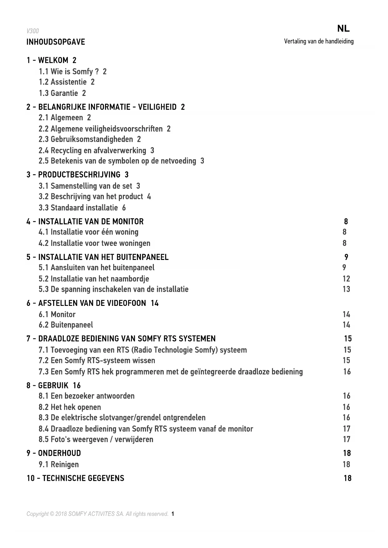 Het ontvangstbereik wordt beperkt door de regelgeving inzake draadloze apparaten. Het ontvangstbereik is sterk afhankelijk van de gebruiksomgeving: storingen veroorzaakt door grote elektrische apparaten in de buurt van de installatie, de gebruikte materialen voor de muren en wanden van de locatie. Het gebruik van een draadloze apparaten (bijvoorbeeld een draadloze hifi hoofdtelefoon) die op dezelfde radiofrequentie werken kan de prestaties van het product negatief beïnvloeden. De camera van deze videofoon is alleen bedoeld om een bezoeker te herkennen en mag nooit en te nimmer worden gebruikt als bewakingscamera. Deze installatie moet worden gebruikt in overeenstemming met de wet op de bescherming van de privacy. Gebruik van deze producten anders dans in het kader van een strikt persoonlijk gebruik is onderworpen aan wettelijke gebruiksverplichtingen en is onderworpen aan de voorafgaande aanvraag van vergunningen bij de overheid. De koper is civiel- en strafrechtelijk aansprakelijk in geval van ongepast gebruik van het apparaat, zoals het schenden van de persoonlijke levenssfeer of het beeldrecht van derden. Somfy wijst elke aansprakelijkheid af voor een gebruik van de videofoon dat strijdig is met de geldende wettelijk bepalingen en verordeningen.Copyright © 2018 SOMFY ACTIVITES SA. All rights reserved. 3 V300