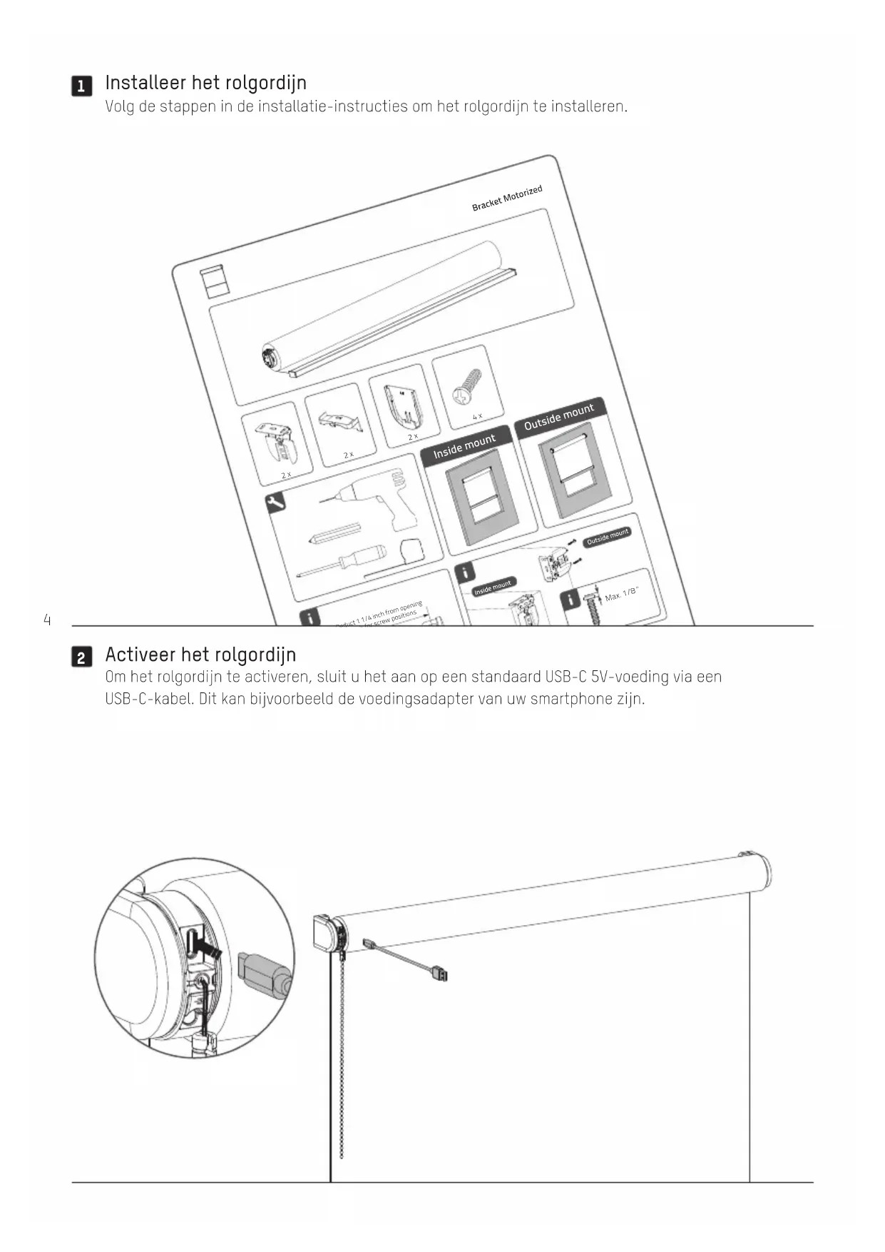 Installeer het rolgordijn Activeer het rolgordijn Volg de stappen in de installatie-instructies om het rolgordijn te installeren. Om het rolgordijn te activeren, sluit u het aan op een standaard USB-C 5V-voeding via een USB-C-kabel. Dit kan bijvoorbeeld de voedingsadapter van uw smartphone zijn.5 1234-567-8901 1234-567-8901
