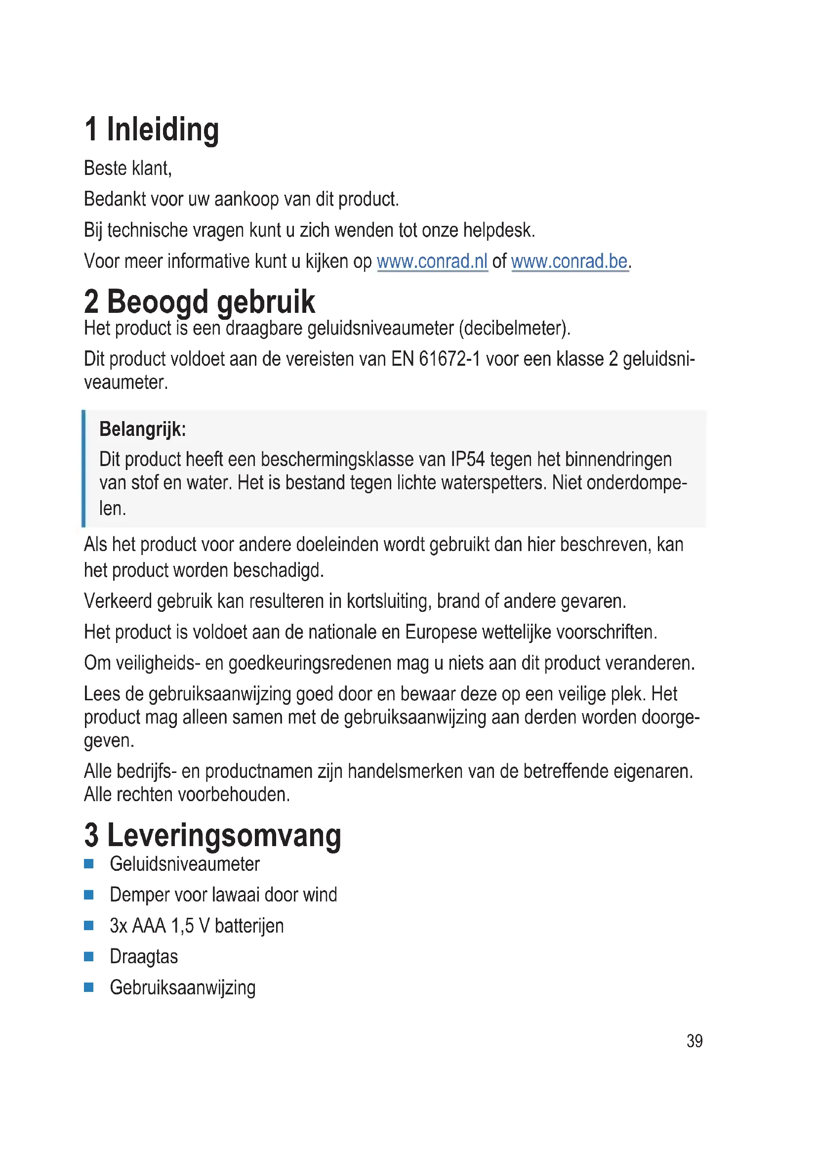 13 Technische gegevens............................................................................... 4839 1 Inleiding Beste klant, Bedankt voor uw aankoop van dit product. Bij technische vragen kunt u zich wenden tot onze helpdesk. Voor meer informative kunt u kijken op www.conrad.nl of www.conrad.be. 2 Beoogd gebruik Het product is een draagbare geluidsniveaumeter (decibelmeter). Dit product voldoet aan de vereisten van EN 61672-1 voor een klasse 2 geluidsni- veaumeter. Belangrijk: Dit product heeft een beschermingsklasse van IP54 tegen het binnendringen van stof en water. Het is bestand tegen lichte waterspetters. Niet onderdompe- len. Als het product voor andere doeleinden wordt gebruikt dan hier beschreven, kan het product worden beschadigd. Verkeerd gebruik kan resulteren in kortsluiting, brand of andere gevaren. Het product is voldoet aan de nationale en Europese wettelijke voorschriften. Om veiligheids- en goedkeuringsredenen mag u niets aan dit product veranderen. Lees de gebruiksaanwijzing goed door en bewaar deze op een veilige plek. Het product mag alleen samen met de gebruiksaanwijzing aan derden worden doorge- geven. Alle bedrijfs- en productnamen zijn handelsmerken van de betreffende eigenaren. Alle rechten voorbehouden. 3 Leveringsomvang