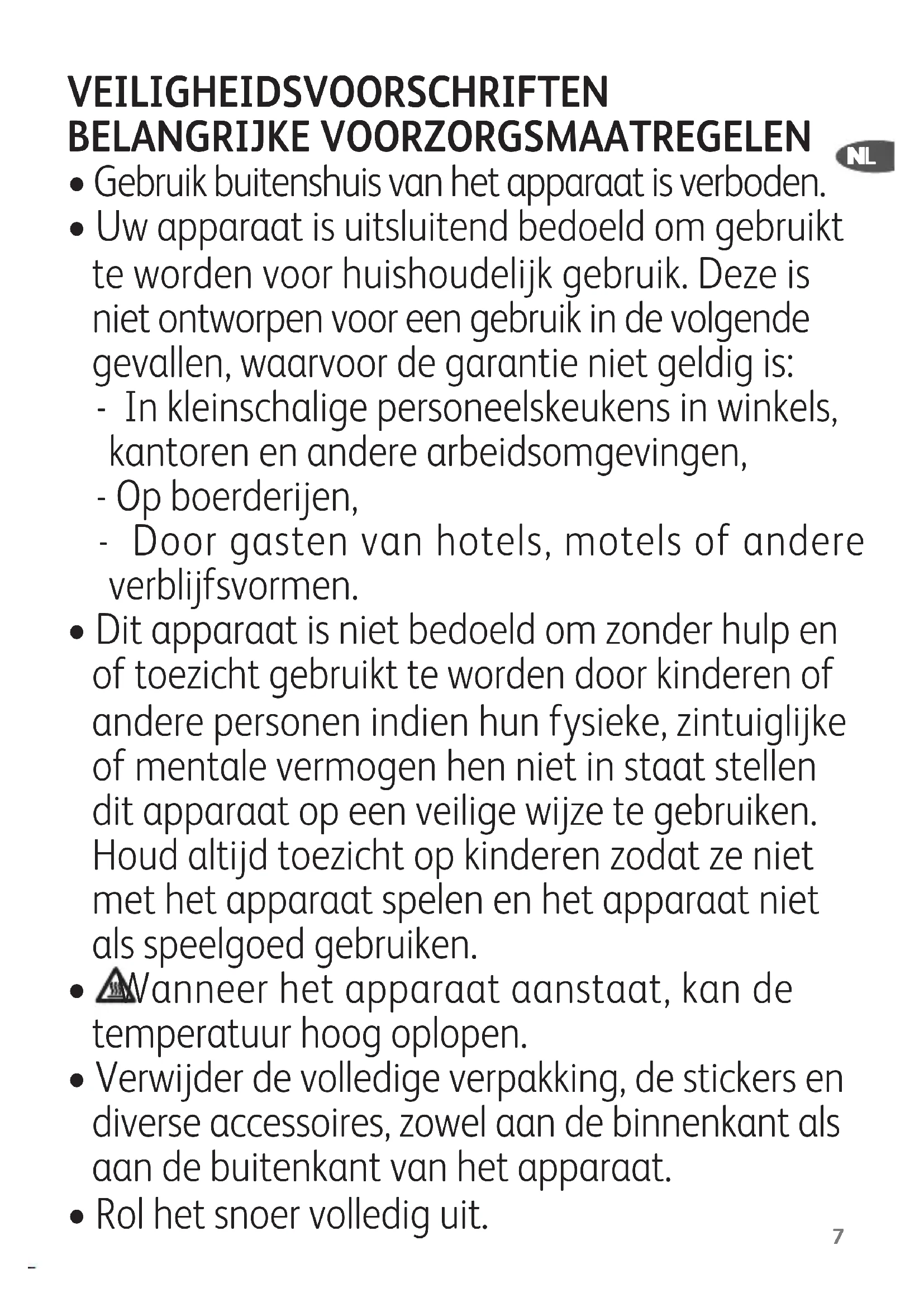 Dit apparaat mag worden gebruikt door kinderen vanaf 8 jaar oud en personen met beperkte fysische, visuele of mentale mogelijkheden,ofdiegebrekaanervaringen kennishebben,indienzeondertoezichtstaan ofgepasteinstructieshebbengekregenzodat zehetapparaatopeenveiligemanierkunnen gebruikenenopdehoogtezijnvandegevaren die het gebruik van het apparaat met zich meebrengt.Kinderenmogenhetapparaatniet reinigenofonderhoudentenzijzeouderdan8 jaarzijnenondertoezichtstaan. Houdhetapparaatendienssnoerbuitenbereik vankinderenonderde8jaar.