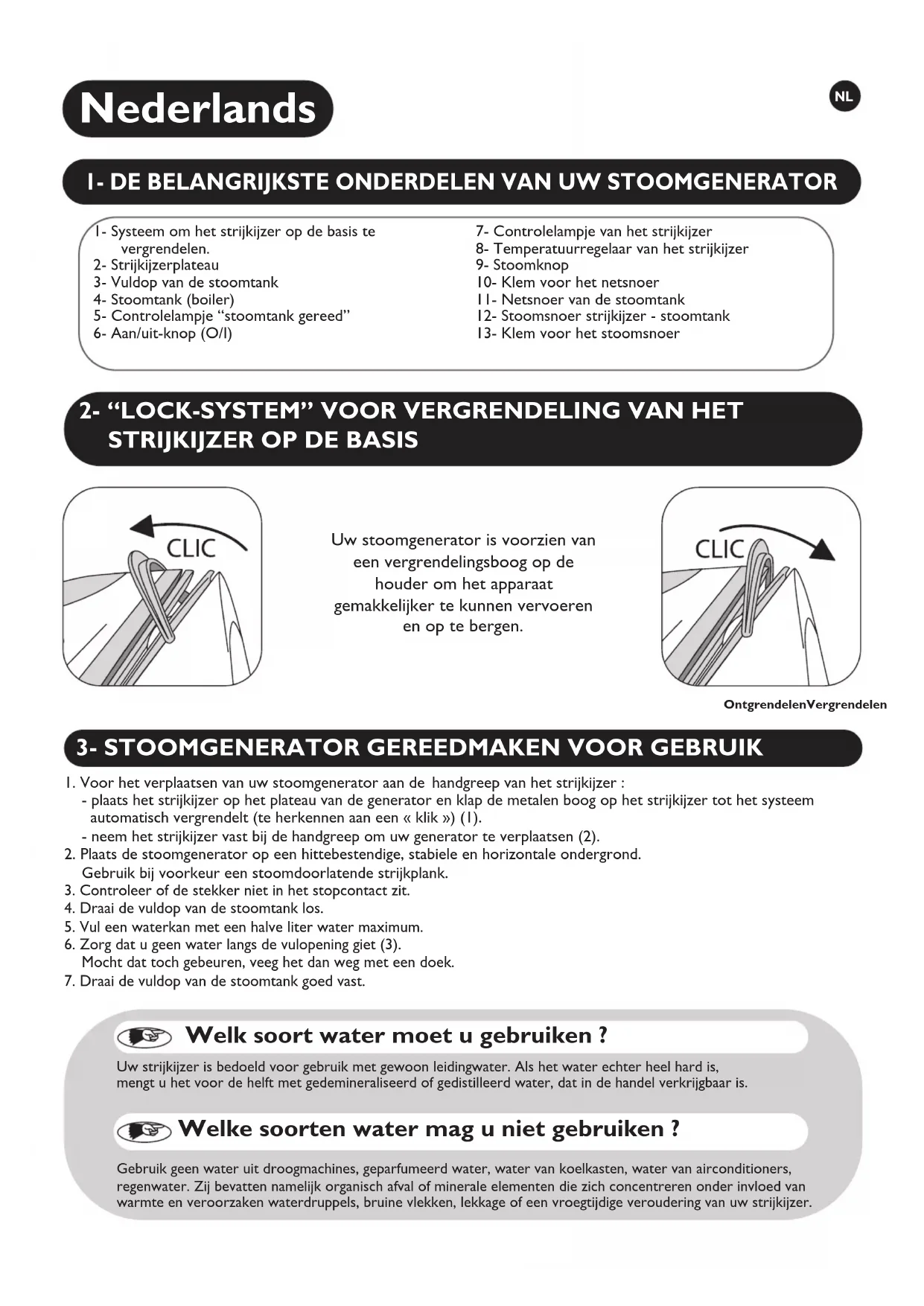 - Gebruik de stoomgenerator niet meer en raadpleeg een erkende klantenservice. U kunt altijd rechtstreeks contact opnemen met de consumentenservice van Groupe SEB Nederland BV of Groupe SEB Belgium SA (zie hiervoor de bijgevoegde servicelijst) indien u de oorzaak van het probleem niet zelf heeft kunnen vinden. Demonteer het apparaat nooit zelf !3- FORBEREDELSE AF DAMPGENERATOREN