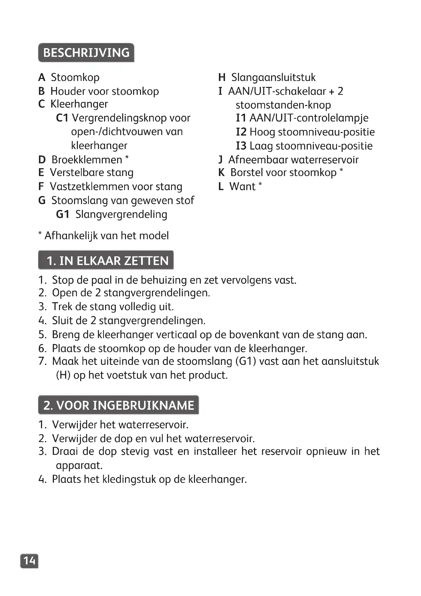 - Ne lavez ni ne rincez jamais l'appareil directement sous le robinet.14 BESCHRIJVING A Stoomkop B Houder voor stoomkop C Kleerhanger C1 Vergrendelingsknop voor open-/dichtvouwen van kleerhanger D Broekklemmen * E Verstelbare stang F Vastzetklemmen voor stang G Stoomslang van geweven stof G1 Slangvergrendeling H Slangaansluitstuk I AAN/UIT-schakelaar + 2 stoomstanden-knop I1 AAN/UIT-controlelampje I2 Hoog stoomniveau-positie I3 Laag stoomniveau-positie J Afneembaar waterreservoir K Borstel voor stoomkop * L Want *