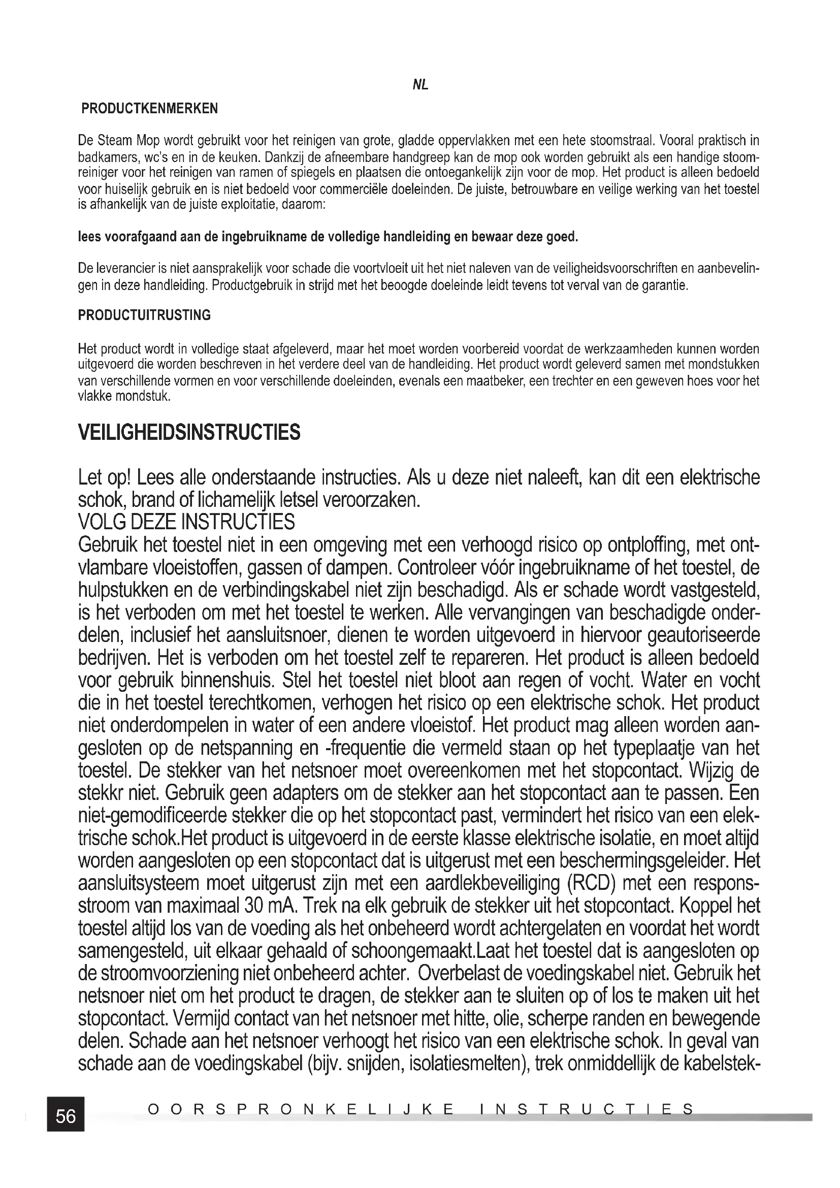 PRODUCTKENMERKEN De Steam Mop wordt gebruikt voor het reinigen van grote, gladde oppervlakken met een hete stoomstraal. Vooral praktisch in badkamers, wc’s en in de keuken. Dankzij de afneembare handgreep kan de mop ook worden gebruikt als een handige stoom- reiniger voor het reinigen van ramen of spiegels en plaatsen die ontoegankelijk zijn voor de mop. Het product is alleen bedoeld voor huiselijk gebruik en is niet bedoeld voor commerciële doeleinden. De juiste, betrouwbare en veilige werking van het toestel is afhankelijk van de juiste exploitatie, daarom: lees voorafgaand aan de ingebruikname de volledige handleiding en bewaar deze goed. De leverancier is niet aansprakelijk voor schade die voortvloeit uit het niet naleven van de veiligheidsvoorschriften en aanbevelin- gen in deze handleiding. Productgebruik in strijd met het beoogde doeleinde leidt tevens tot verval van de garantie. PRODUCTUITRUSTING Het product wordt in volledige staat afgeleverd, maar het moet worden voorbereid voordat de werkzaamheden kunnen worden uitgevoerd die worden beschreven in het verdere deel van de handleiding. Het product wordt geleverd samen met mondstukken van verschillende vormen en voor verschillende doeleinden, evenals een maatbeker, een trechter en een geweven hoes voor het vlakke mondstuk. VEILIGHEIDSINSTRUCTIES Let op! Lees alle onderstaande instructies. Als u deze niet naleeft, kan dit een elektrische schok, brand of lichamelijk letsel veroorzaken.