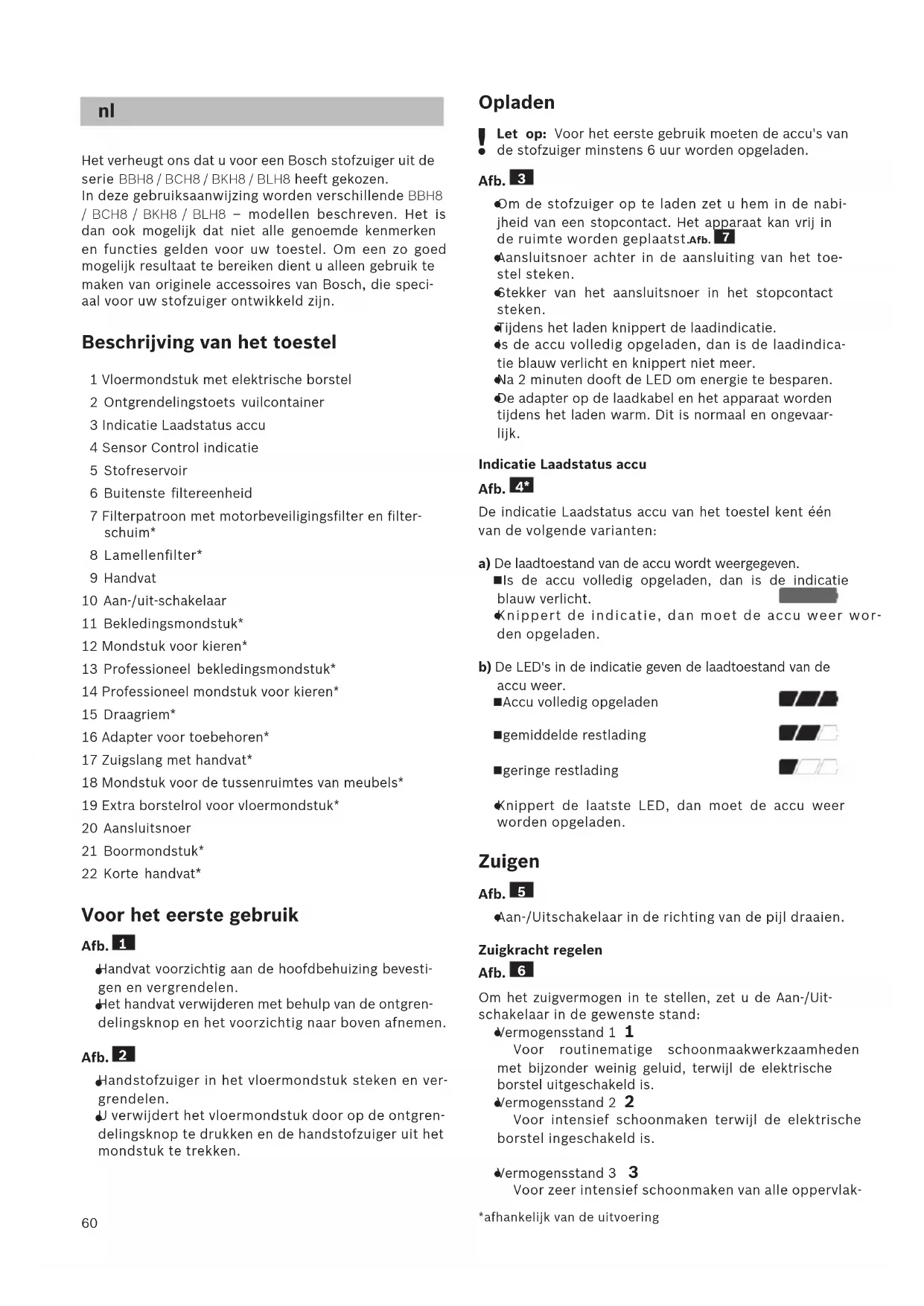 Het verheugt ons dat u voor een Bosch stofzuiger uit de serie BBH8 / BCH8 / BKH8 / BLH8 heeft gekozen. In deze gebruiksaanwijzing worden verschillende BBH8 / BCH8 / BKH8 / BLH8 – modellen beschreven. Het is dan ook mogelijk dat niet alle genoemde kenmerken en functies gelden voor uw toestel. Om een zo goed mogelijk resultaat te bereiken dient u alleen gebruik te maken van originele accessoires van Bosch, die speci- aal voor uw stofzuiger ontwikkeld zijn. Beschrijving van het toestel 1 Vloermondstuk met elektrische borstel 2 Ontgrendelingstoets vuilcontainer 3 Indicatie Laadstatus accu 4 Sensor Control indicatie 5 Stofreservoir 6 Buitenste filtereenheid 7 Filterpatroon met motorbeveiligingsfilter en filter- schuim* 8 Lamellenfilter* 9 Handvat 10 Aan-/uit-schakelaar 11 Bekledingsmondstuk* 12 Mondstuk voor kieren* 13 Professioneel bekledingsmondstuk* 14 Professioneel mondstuk voor kieren* 15 Draagriem* 16 Adapter voor toebehoren* 17 Zuigslang met handvat* 18 Mondstuk voor de tussenruimtes van meubels* 19 Extra borstelrol voor vloermondstuk* 20 Aansluitsnoer 21 Boormondstuk* 22 Korte handvat* Voor het eerste gebruik Afb.