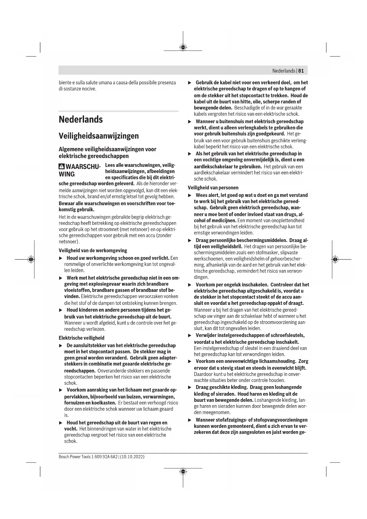 125 6 10 X-LOCK >0 11.500 80 Rotazione della testa ingranaggi (vedere fig.E) u Prima di qualunque intervento sull’elettroutensile estrarre la spina di rete dalla presa. La testa ingranaggi è ruotabile a scatti di 90°. In questo mo- do è possibile portare l’interruttore di avvio/arresto in una posizione più comoda in funzione della situazione di lavoro, ades. per i mancini. Bosch Power Tools 1 609 92A 6A2 | (10.10.2022)78 | Italiano Svitare completamente le 4 viti(➊). Ruotare con cautela la testa ingranaggi nella nuova posizione(➋), senza estrarla dalla carcassa. Serrare di nuovo saldamente le 4 viti(➌). Smontare il filtro per polvere (vedere figg.F eG ) Sfilare il filtro per polvere(5) sul lato inferiore dell’elettrou- tensile nella direzione della freccia. Non afferrare il filtro per polvere(5) da un lato e sfilarlo. Aspirazione polvere/aspirazione trucioli Polveri e materiali come vernici contenenti piombo, alcuni ti- pi di legname, minerali e metalli possono essere dannosi per la salute. Il contatto oppure l’inalazione delle polveri possono causare reazioni allergiche e/o malattie delle vie respiratorie dell’operatore oppure delle persone che si trovano nelle vici- nanze. Determinate polveri come polvere da legname di faggio o di quercia sono considerate cancerogene, in modo particolare insieme ad additivi per il trattamento del legname (cromato, protezione per legno). Materiale contenente amianto deve essere lavorato esclusivamente da personale specializzato. – Utilizzare possibilmente un’aspirazione polvere adatta per il materiale. – Provvedere ad una buona aerazione del posto di lavoro. – Si consiglia di portare una mascherina protettiva con clas- se di filtraggio P2. Osservare le norme in vigore nel vostro Paese per i materiali da lavorare. u Evitare accumuli di polvere nella postazione di lavoro. Le polveri si possono incendiare facilmente. Uso u Non sollecitare l’elettroutensile al punto tale da com- portarne l’arresto. u Prima di qualunque intervento sull’elettroutensile estrarre la spina di rete dalla presa. u Prestare attenzione, qualora si realizzino intagli in pa- reti portanti: vedere il paragrafo «Avvertenze riguar- do alla statica». u Serrare il pezzo in lavorazione, qualora il suo peso non consenta di posizionarlo in sicurezza. u Dopo un’elevata sollecitazione, lasciar funzionare a vuoto l’elettroutensile ancora per alcuni minuti, in mo- do da lasciarne raffreddare l’accessorio. u Non utilizzare l’elettroutensile con un supporto per la troncatura. u Non afferrare i dischi di levigatura e di taglio con le mani prima che si siano raffreddati. Durante il lavoro, i dischi raggiungono temperature molto elevate. Indicazioni operative Levigatura a sgrossare u Per i lavori di sgrossatura con abrasivi legati, utilizza- re sempre la cuffia di protezione per la levigatura (11). u Mai utilizzare mole abrasive da taglio diritto per lavori di sgrossatura. u Per i lavori di sgrossatura la cuffia di protezione per il taglio (13) o la cuffia di protezione per la levigatura (11) con copertura per il taglio montata (15) potrebbe urtare il pezzo in lavorazione e provocare la perdita del controllo. Per la sgrossatura, i migliori risultati si otterranno con un an- golo d’incidenza fra 30° e 40°. Muovere alternativamente l’elettroutensile, esercitando una moderata pressione. In questo modo il pezzo in lavorazione non si surriscalderà, non scolorirà e non verrà rigato. u In caso di impiego di mole legate, ammesse sia per il ta- glio che per la levigatura, occorre utilizzare la cuffia di protezione per il taglio (13) o la cuffia di protezione per la levigatura (11) con copertura per il taglio montata (15). Levigatura di superfici con disco lamellare u Durante la levigatura con il disco lamellare, utilizzare sempre l’apposita cuffia di protezione (11). Il disco lamellare (accessorio) consente di lavorare anche su- perfici e profili di forma bombata. I dischi lamellari hanno una durata nettamente superiore, una minore rumorosità e temperature di levigatura inferiori rispetto alle convenzionali mole abrasive. Levigatura di superfici con platorello u Per operazioni con il platorello in gomma (20), monta- re sempre la protezione per le mani (19). La levigatura con platorello può essere effettuata senza cuf- fia di protezione. La sequenza di montaggio è riportata alla pagina con rappre- sentazione grafica. Spazzola a tazza/spazzola a disco/spazzola conica u Durante la spazzolatura con spazzole a disco, utilizza- re sempre l’apposita cuffia di protezione per la leviga- tura (11). La spazzolatura con spazzole a tazza/spaz- zole coniche può essere effettuata senza cuffia di pro- tezione. u Per operazioni con la spazzola a tazza o la spazzola co- nica montare sempre la protezione per le mani (19). u I fili delle spazzole a disco possono rimanere intrappo- lati nella cuffia di protezione e rompersi, qualora le di- mensioni massime ammesse delle spazzole a disco vengano superate. La sequenza di montaggio è riportata alla pagina con rappre- sentazione grafica. Taglio del metallo u Durante il taglio del metallo con mole da taglio legate o mole da taglio diamantate, utilizzare sempre la cuf- fia di protezione per il taglio (13) o la cuffia di prote- 1 609 92A 6A2 | (10.10.2022) Bosch Power ToolsItaliano | 79 zione per la levigatura (11) con copertura per il taglio montata (15). u In caso di impiego della cuffia di protezione per la levi- gatura (11) per operazioni di taglio con mole da taglio legate, sussiste un maggior rischio di esposizione a scintille e particelle nonché a frammenti di mole in ca- so di rottura della mola. Per la troncatura, operare con un avanzamento moderato e idoneo al materiale da lavorare. Non esercitare pressione sulla mola da taglio ed evitare di angolarla e di farla oscillare. Non frenare le mole da taglio in rallentamento esercitando una contropressione laterale. L’elettroutensile andrà sem- pre condotto in controro