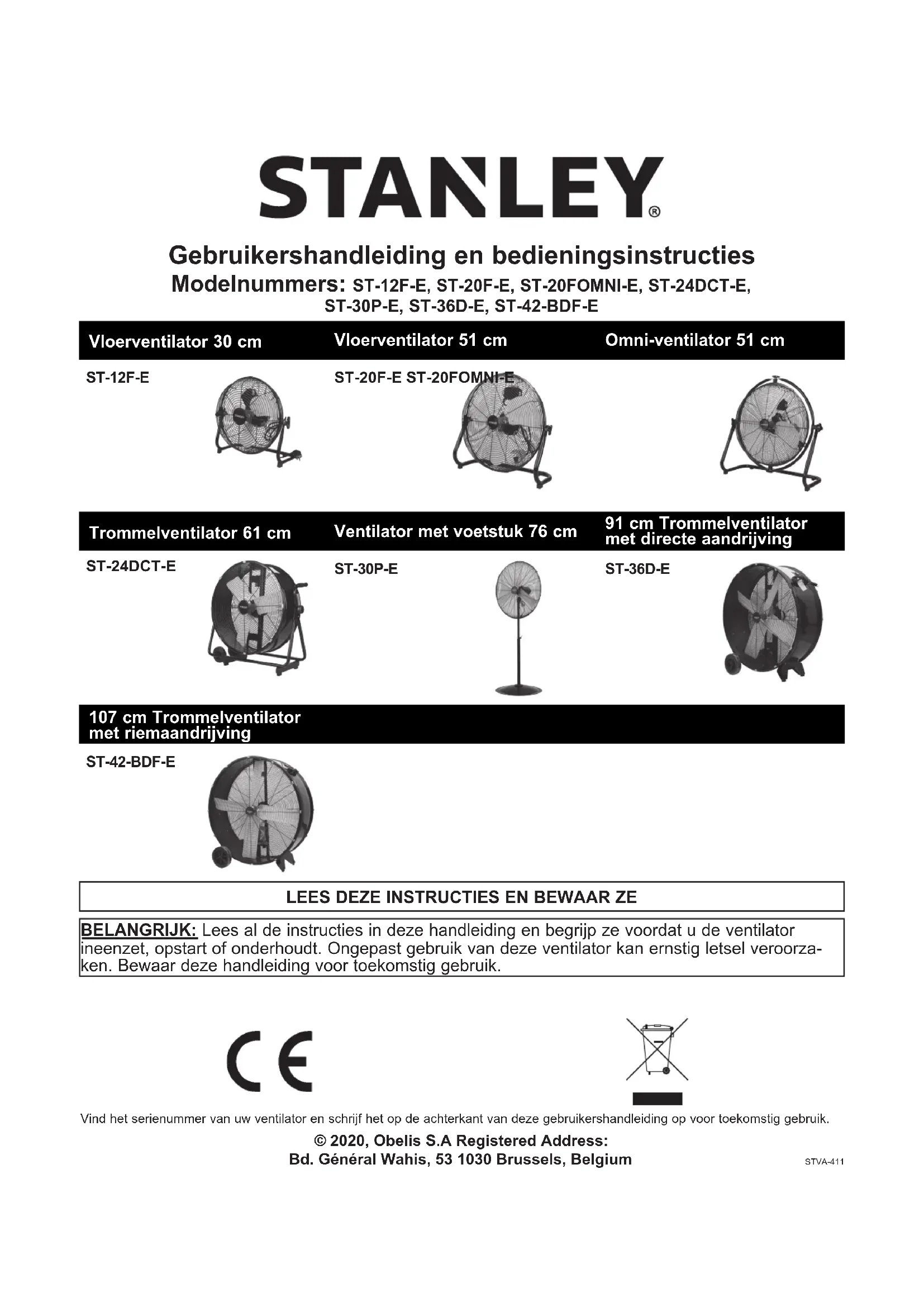 BELANGRIJK: Lees al de instructies in deze handleiding en begrijp ze voordat u de ventilator ineenzet, opstart of onderhoudt. Ongepast gebruik van deze ventilator kan ernstig letsel veroorza- ken. Bewaar deze handleiding voor toekomstig gebruik. Modelnummers: ST-12F-E, ST-20F-E, ST-20FOMNI-E, ST-24DCT-E,