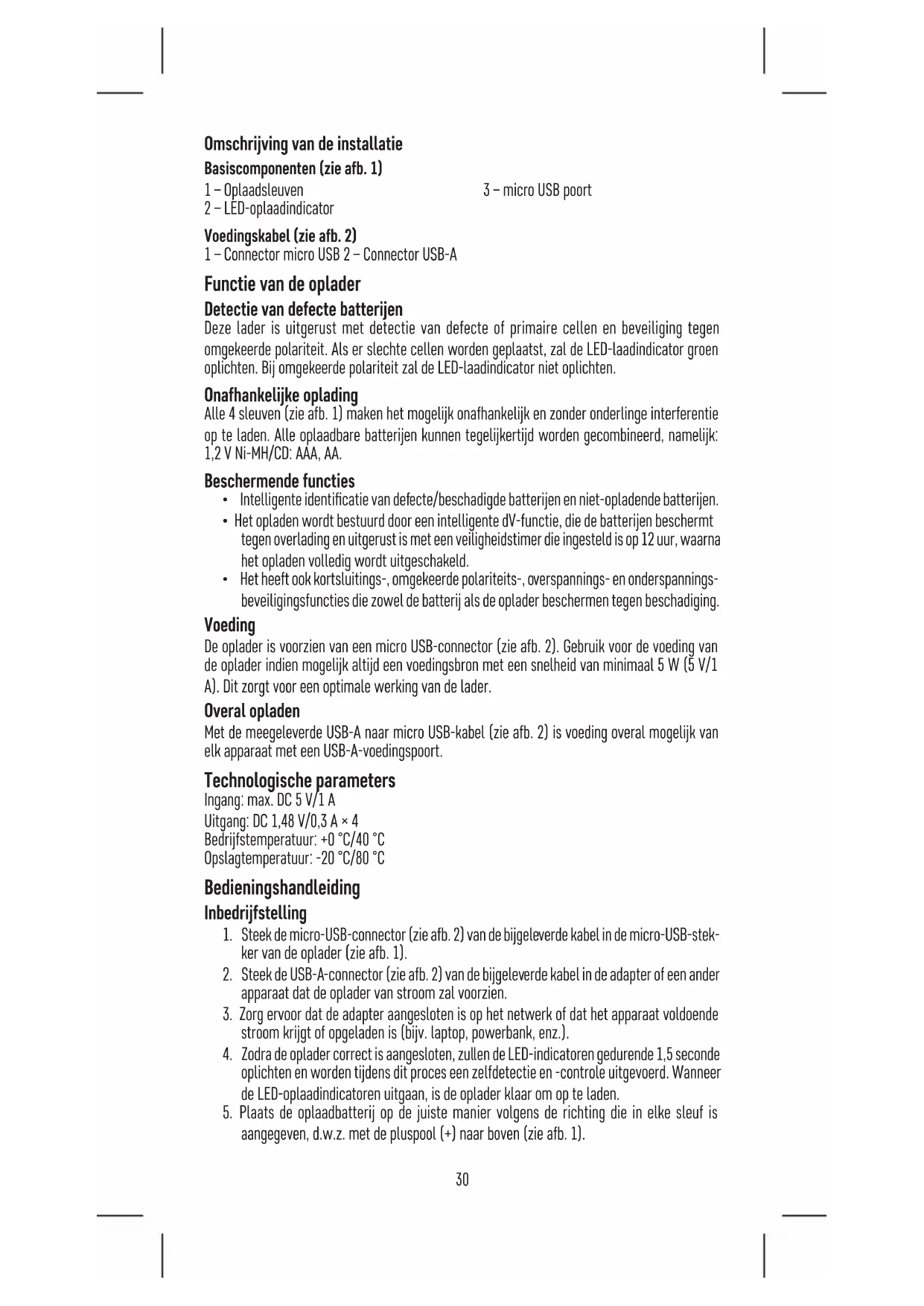 - Het heeft ook kortsluitings-, omgekeerde polariteits-, overspannings- en onderspannings- beveiligingsfuncties die zowel de batterij als de oplader beschermen tegen beschadiging. Voeding De oplader is voorzien van een micro USB-connector (zie afb. 2). Gebruik voor de voeding van de oplader indien mogelijk altijd een voedingsbron met een snelheid van minimaal 5 W (5 V/1 A). Dit zorgt voor een optimale werking van de lader. Overal opladen Met de meegeleverde USB-A naar micro USB-kabel (zie afb. 2) is voeding overal mogelijk van elk apparaat met een USB-A-voedingspoort. Technologische parameters Ingang: max. DC 5 V/1 A Uitgang: DC 1,48 V/0,3 A × 4 Bedrijfstemperatuur: +0 °C/40 °C Opslagtemperatuur: -20 °C/80 °C Bedieningshandleiding Inbedrijfstelling