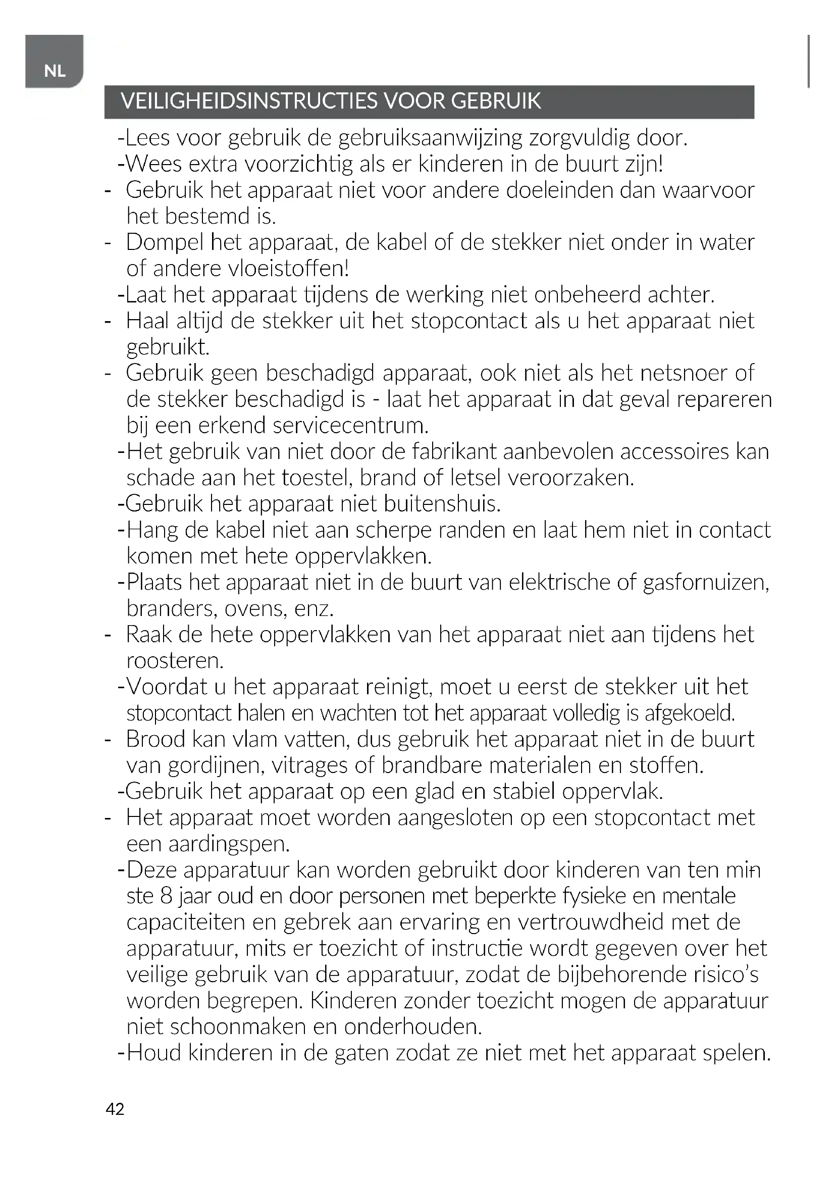 Houd het apparaat en de kabel buiten het bereik van kinderen jonger dan 8 jaar. - Zorg dat uw handen droog zijn voordat u de stekker aanraakt of het broodrooster aanzet. - Het apparaat is uitsluitend bestemd voor huishoudelijk gebruik.