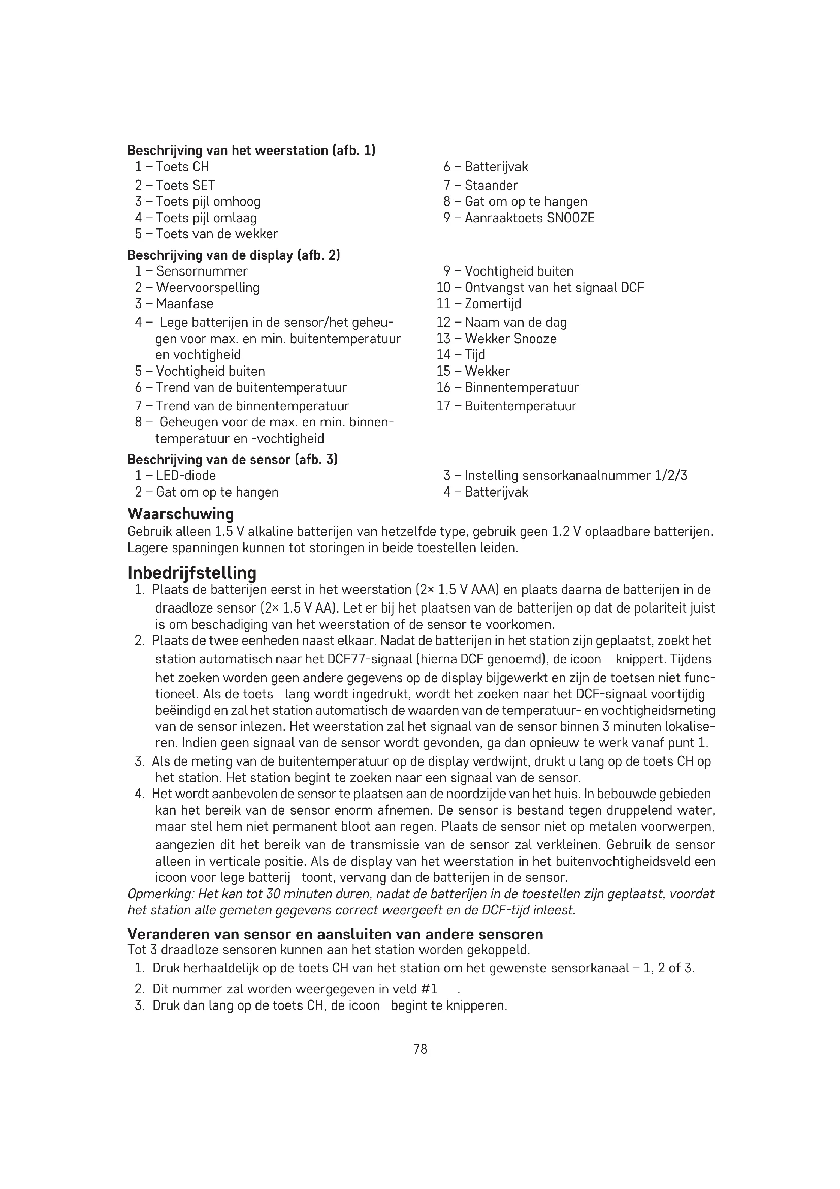 kan het bereik van de sensor enorm afnemen. De sensor is bestand tegen druppelend water, maar stel hem niet permanent bloot aan regen. Plaats de sensor niet op metalen voorwerpen, aangezien dit het bereik van de transmissie van de sensor zal verkleinen. Gebruik de sensor alleen in verticale positie. Als de display van het weerstation in het buitenvochtigheidsveld een icoon voor lege batterij toont, vervang dan de batterijen in de sensor. Opmerking: Het kan tot 30 minuten duren, nadat de batterijen in de toestellen zijn geplaatst, voordat het station alle gemeten gegevens correct weergeeft en de DCF-tijd inleest. Veranderen van sensor en aansluiten van andere sensoren Tot 3 draadloze sensoren kunnen aan het station worden gekoppeld.