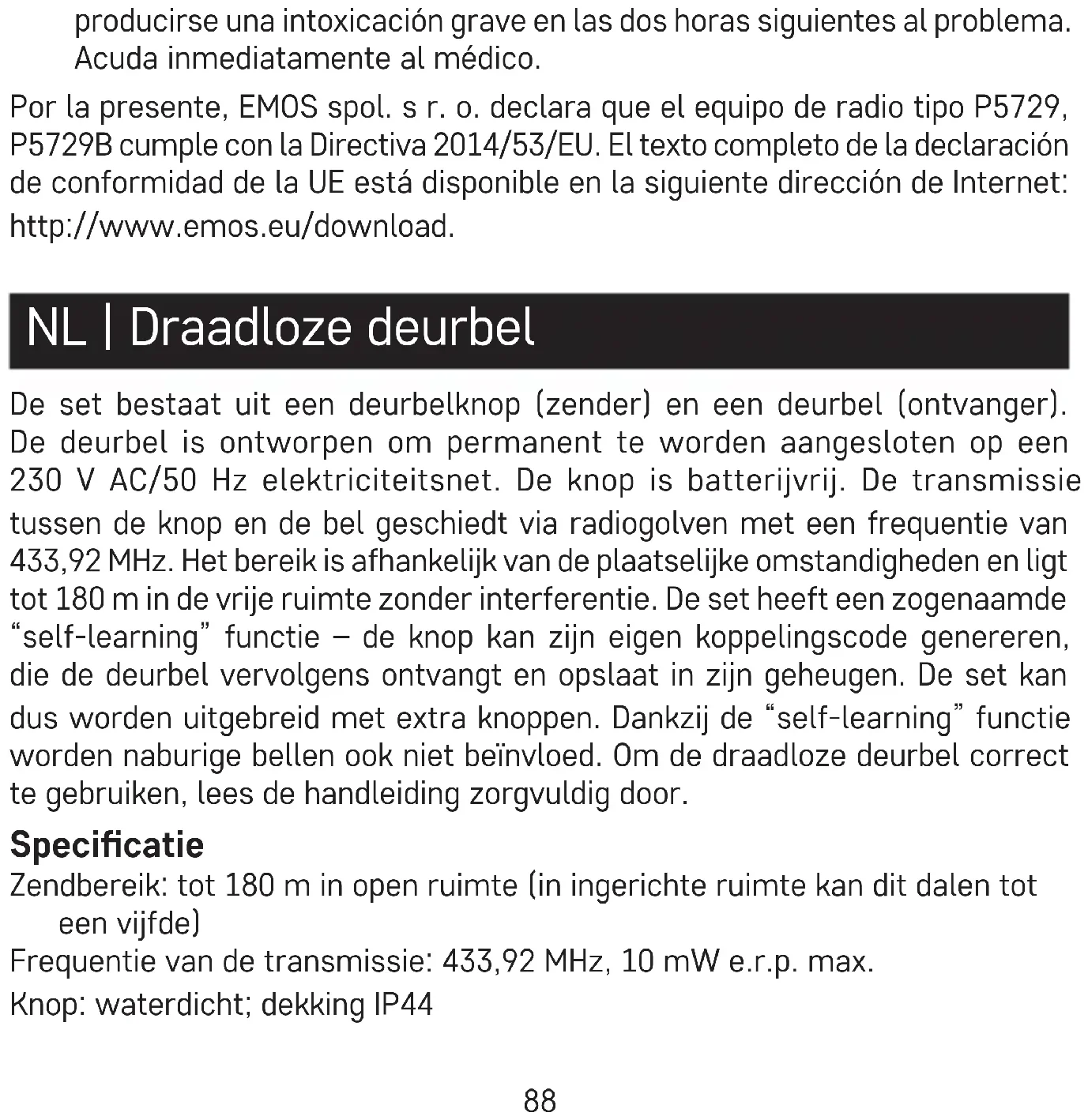 - Buiten het bereik van kinderen houden. Inslikken kan leiden tot chemische vergiftiging, perforatie van weke delen en de dood. Ernstige vergiftiging kan optreden binnen twee uur na problemen. Zoek onmiddellijk medische hulp. Hierbij verklaart EMOS spol. s r. o. dat de radioapparatuur van het type P5729, P5729B in overeenstemming is met de richtlijn 2014/53/EU. De volledige tekst van de EU-conformiteitsverklaring is beschikbaar op het volgende internetadres: http://www.emos.eu/download.94 GARANCIJSKA IZJAVA