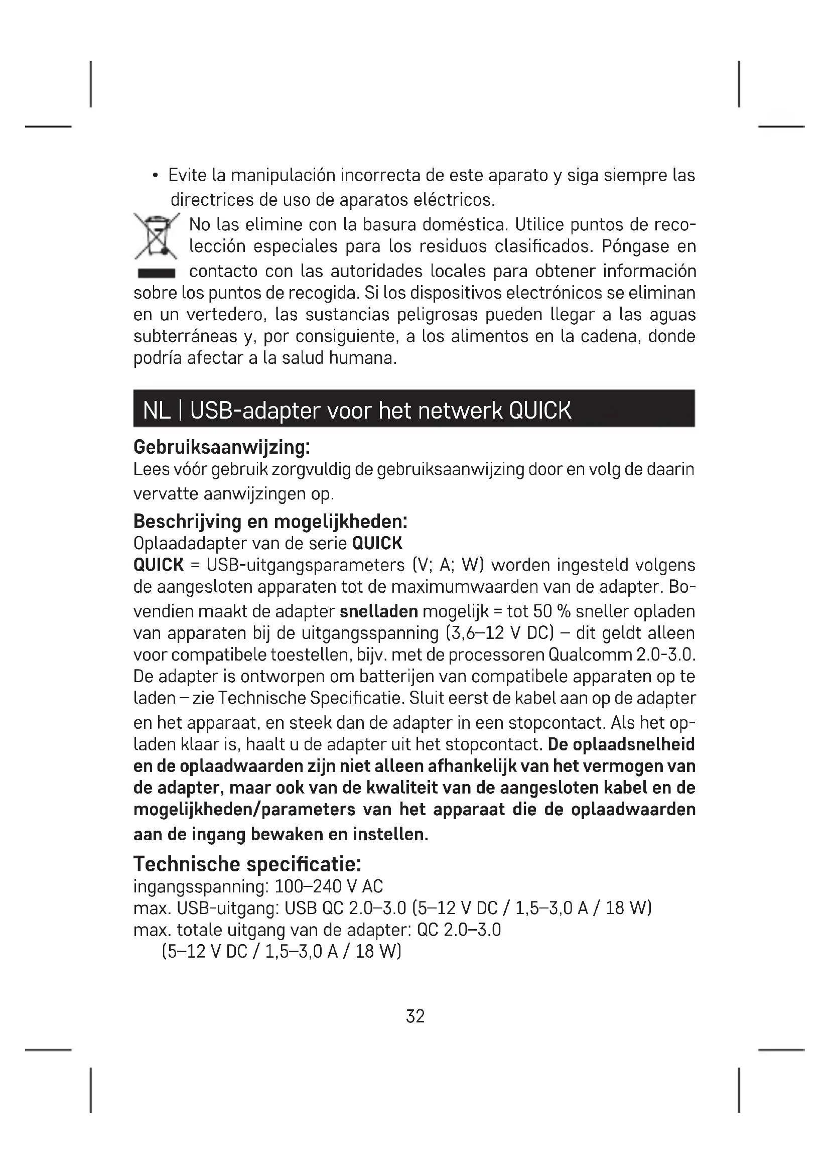 - Evite la manipulación incorrecta de este aparato y siga siempre las directrices de uso de aparatos eléctricos. No las elimine con la basura doméstica. Utilice puntos de reco- lección especiales para los residuos clasicados. Póngase en contacto con las autoridades locales para obtener información sobre los puntos de recogida. Si los dispositivos electrónicos se eliminan en un vertedero, las sustancias peligrosas pueden llegar a las aguas subterráneas y, por consiguiente, a los alimentos en la cadena, donde podría afectar a la salud humana. NL | USB-adapter voor het netwerk QUICK Gebruiksaanwijzing: Lees vóór gebruik zorgvuldig de gebruiksaanwijzing door en volg de daarin vervatte aanwijzingen op. Beschrijving en mogelijkheden: Oplaadadapter van de serie QUICK QUICK = USB-uitgangsparameters (V; A; W) worden ingesteld volgens de aangesloten apparaten tot de maximumwaarden van de adapter. Bo- vendien maakt de adapter snelladen mogelijk = tot 50 % sneller opladen van apparaten bij de uitgangsspanning (3,6–12 V DC) – dit geldt alleen voor compatibele toestellen, bijv. met de processoren Qualcomm 2.0-3.0. De adapter is ontworpen om batterijen van compatibele apparaten op te laden – zie Technische Specicatie. Sluit eerst de kabel aan op de adapter en het apparaat, en steek dan de adapter in een stopcontact. Als het op- laden klaar is, haalt u de adapter uit het stopcontact. De oplaadsnelheid en de oplaadwaarden zijn niet alleen afhankelijk van het vermogen van de adapter, maar ook van de kwaliteit van de aangesloten kabel en de mogelijkheden/parameters van het apparaat die de oplaadwaarden aan de ingang bewaken en instellen. Technische specicatie: ingangsspanning: 100–240 V AC max. USB-uitgang: USB QC 2.0–3.0 (5–12 V DC / 1,5–3,0 A / 18 W) max. totale uitgang van de adapter: QC 2.0–3.0 (5–12 V DC / 1,5–3,0 A / 18 W)33 bescherming tegen overbelasting, overspanning en kortsluiting Led-indicatie: geen compatibiliteit: smartphones, tablets en andere apparaten maat: 25 × 44 × 87 mm (diepte × breedte × hoogte) kleur: wit gewicht: 54 g Zorg en onderhoud: