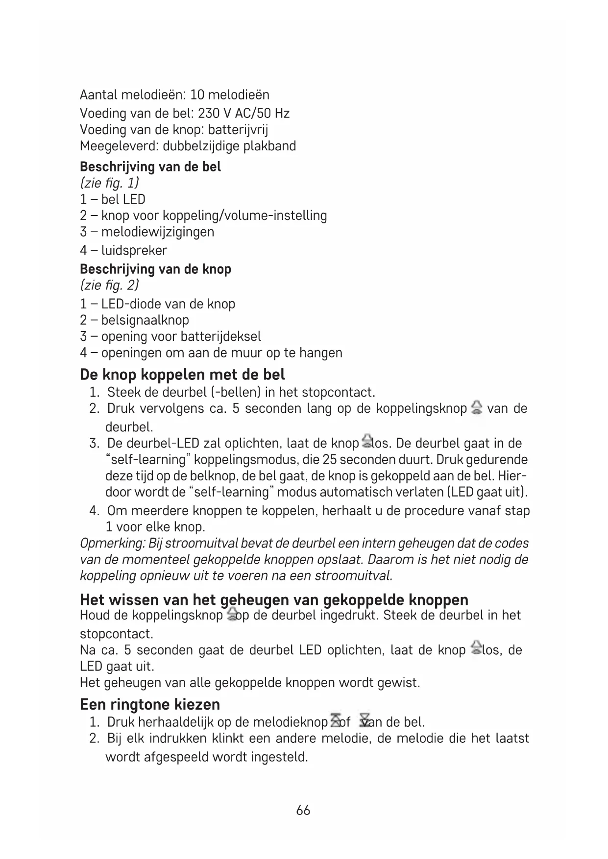 1 voor elke knop. Opmerking: Bij stroomuitval bevat de deurbel een intern geheugen dat de codes van de momenteel gekoppelde knoppen opslaat. Daarom is het niet nodig de koppeling opnieuw uit te voeren na een stroomuitval. Het wissen van het geheugen van gekoppelde knoppen Houd de koppelingsknop op de deurbel ingedrukt. Steek de deurbel in het stopcontact. Na ca. 5 seconden gaat de deurbel LED oplichten, laat de knop los, de LED gaat uit. Het geheugen van alle gekoppelde knoppen wordt gewist. Een ringtone kiezen
