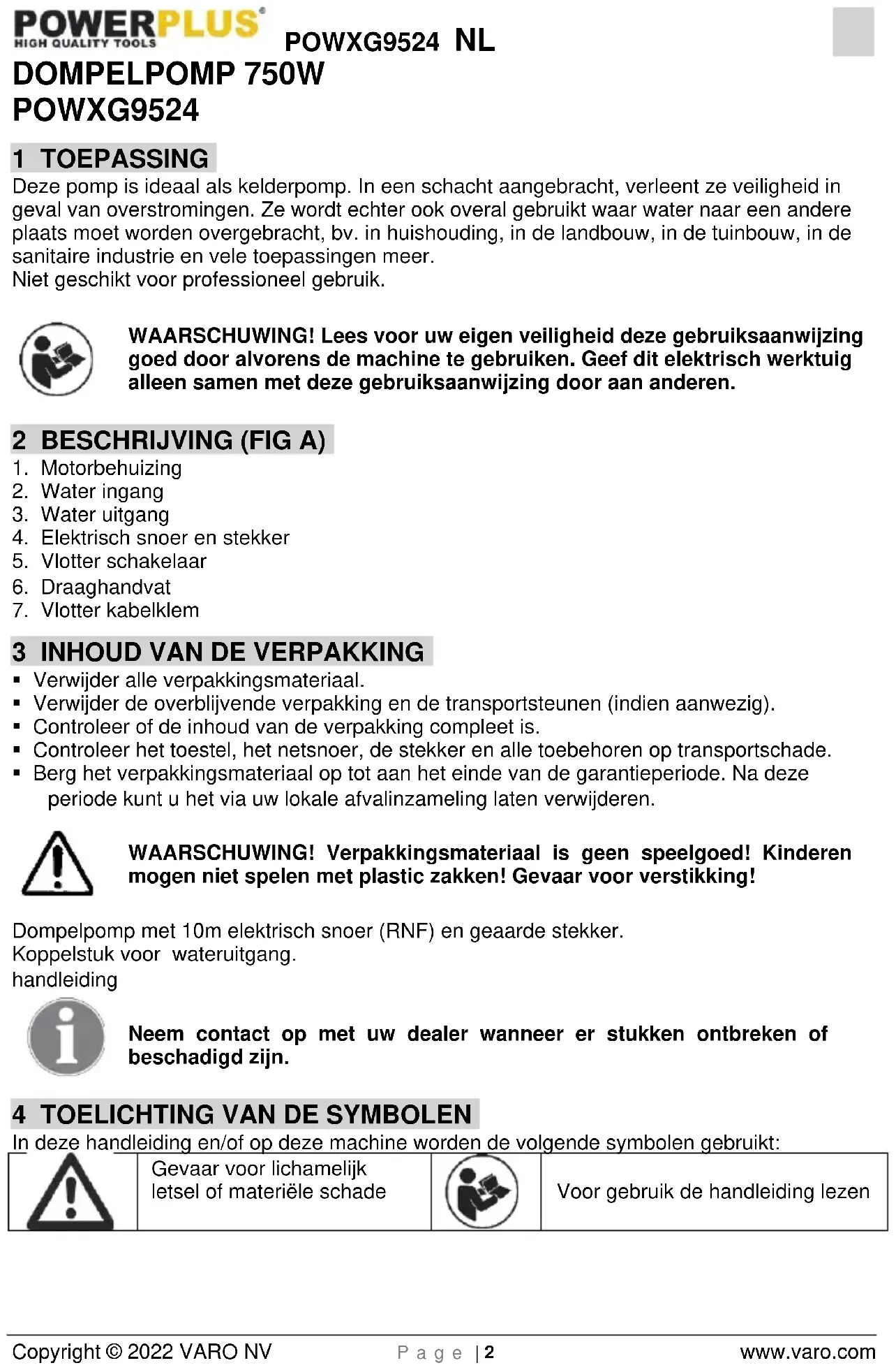 Copyright © 2022 VARO NV P a g e | 2 www.varo.com DOMPELPOMP 750W POWXG9524 1 TOEPASSING Deze pomp is ideaal als kelderpomp. In een schacht aangebracht, verleent ze veiligheid in geval van overstromingen. Ze wordt echter ook overal gebruikt waar water naar een andere plaats moet worden overgebracht, bv. in huishouding, in de landbouw, in de tuinbouw, in de sanitaire industrie en vele toepassingen meer. Niet geschikt voor professioneel gebruik. WAARSCHUWING! Lees voor uw eigen veiligheid deze gebruiksaanwijzing goed door alvorens de machine te gebruiken. Geef dit elektrisch werktuig alleen samen met deze gebruiksaanwijzing door aan anderen. 2 BESCHRIJVING (FIG A)