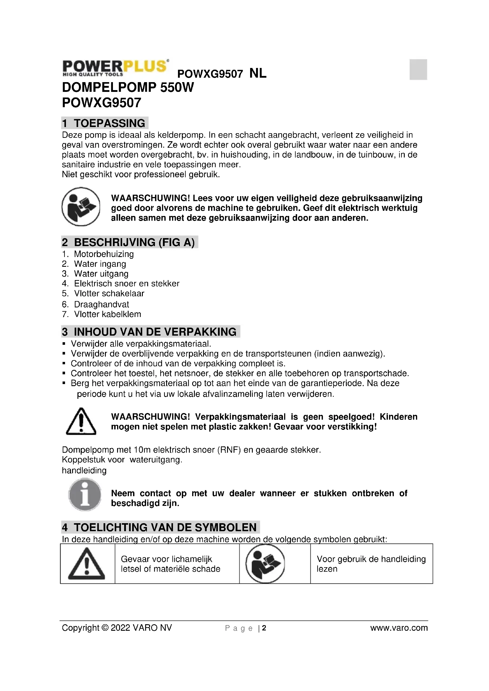Copyright © 2022 VARO NV P a g e | 2 www.varo.com DOMPELPOMP 550W POWXG9507 1 TOEPASSING Deze pomp is ideaal als kelderpomp. In een schacht aangebracht, verleent ze veiligheid in geval van overstromingen. Ze wordt echter ook overal gebruikt waar water naar een andere plaats moet worden overgebracht, bv. in huishouding, in de landbouw, in de tuinbouw, in de sanitaire industrie en vele toepassingen meer. Niet geschikt voor professioneel gebruik. WAARSCHUWING! Lees voor uw eigen veiligheid deze gebruiksaanwijzing goed door alvorens de machine te gebruiken. Geef dit elektrisch werktuig alleen samen met deze gebruiksaanwijzing door aan anderen. 2 BESCHRIJVING (FIG A)