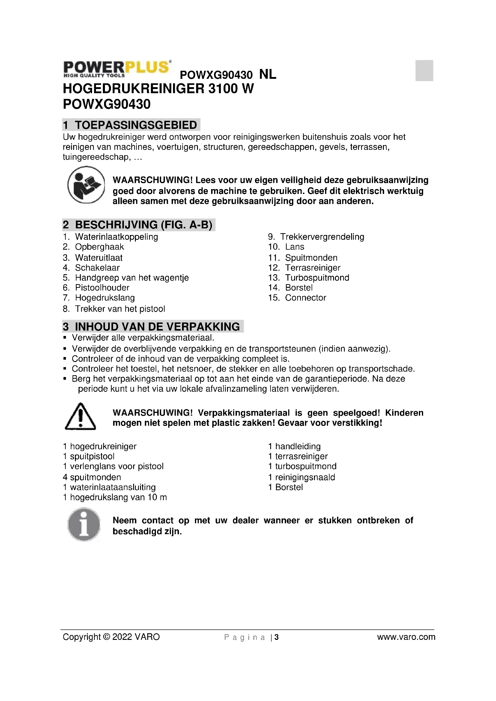 - Berg het verpakkingsmateriaal op tot aan het einde van de garantieperiode. Na deze periode kunt u het via uw lokale afvalinzameling laten verwijderen. WAARSCHUWING! Verpakkingsmateriaal is geen speelgoed! Kinderen mogen niet spelen met plastic zakken! Gevaar voor verstikking! 1 hogedrukreiniger 1 spuitpistool 1 verlenglans voor pistool 4 spuitmonden 1 waterinlaataansluiting 1 hogedrukslang van 10 m 1 handleiding 1 terrasreiniger 1 turbospuitmond 1 reinigingsnaald 1 Borstel Neem contact op met uw dealer wanneer er stukken ontbreken of beschadigd zijn.POWXG90430 NL Copyright © 2022 VARO P a g i n a | 4 www.varo.com