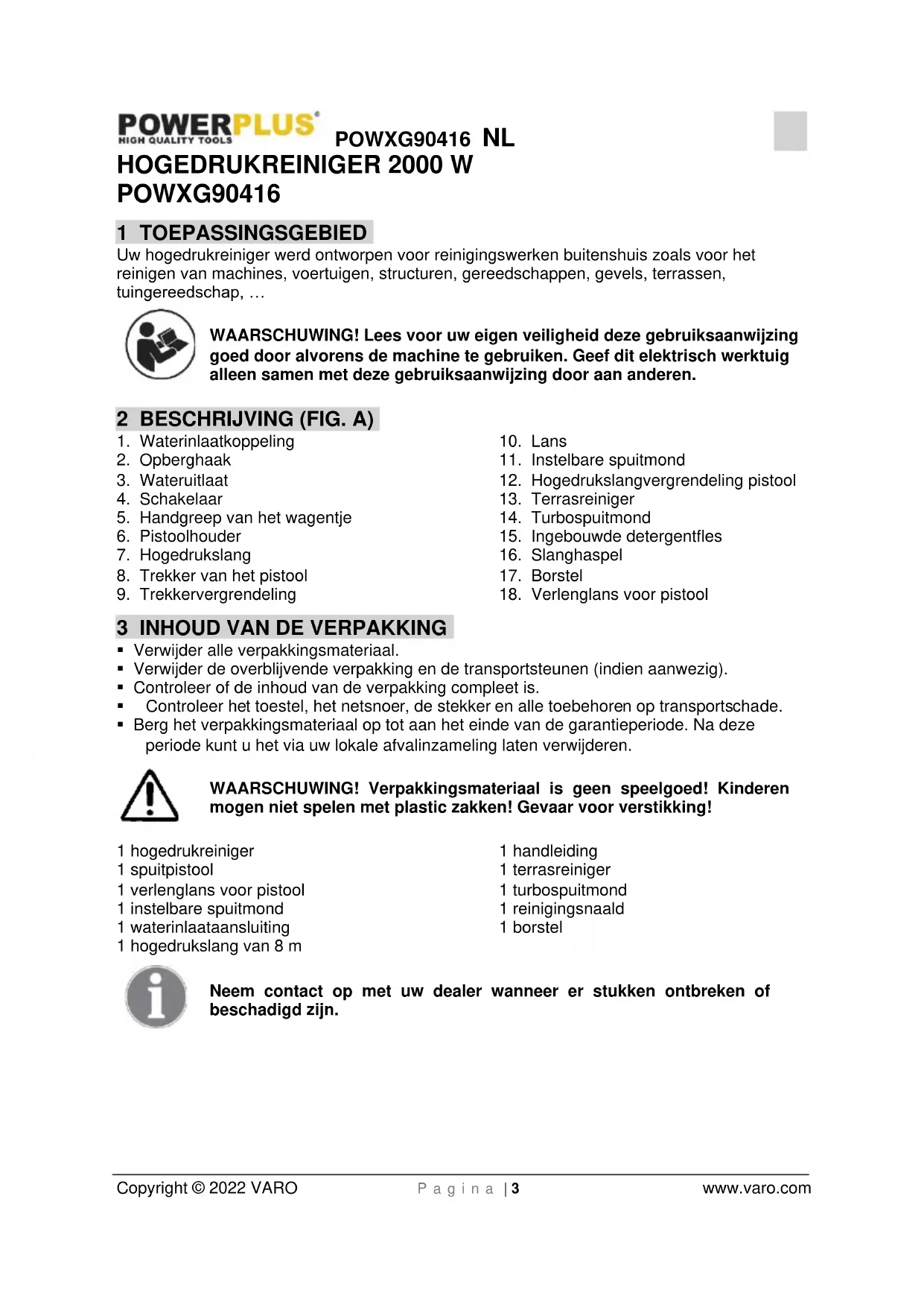 - Berg het verpakkingsmateriaal op tot aan het einde van de garantieperiode. Na deze periode kunt u het via uw lokale afvalinzameling laten verwijderen. WAARSCHUWING! Verpakkingsmateriaal is geen speelgoed! Kinderen mogen niet spelen met plastic zakken! Gevaar voor verstikking! 1 hogedrukreiniger 1 spuitpistool 1 verlenglans voor pistool 1 instelbare spuitmond 1 waterinlaataansluiting 1 hogedrukslang van 8 m 1 handleiding 1 terrasreiniger 1 turbospuitmond 1 reinigingsnaald 1 borstel Neem contact op met uw dealer wanneer er stukken ontbreken of beschadigd zijn.POWXG90416 NL Copyright © 2022 VARO P a g i n a | 4 www.varo.com