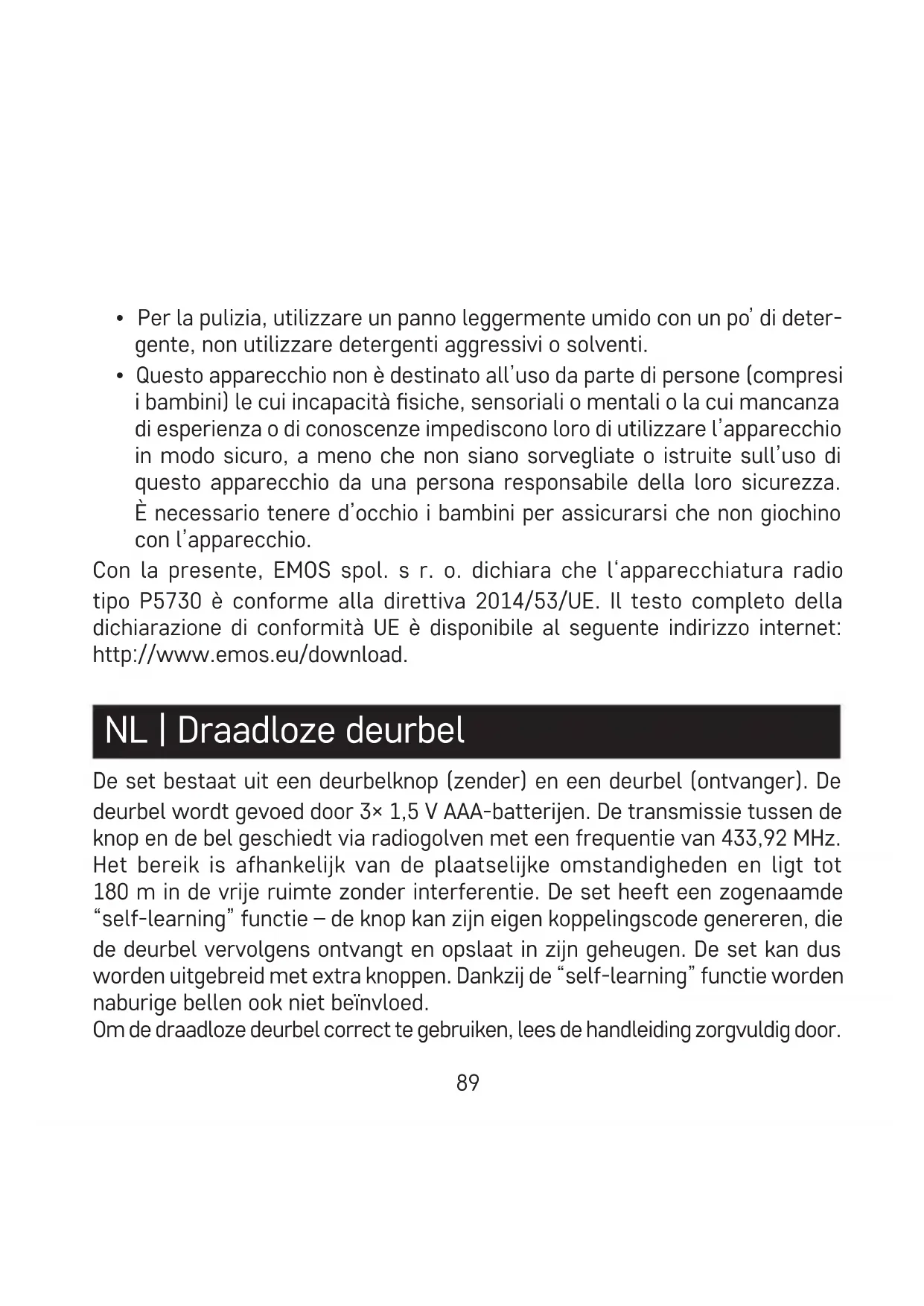 - De bel (ontvanger) is uitsluitend bedoeld voor gebruik binnenshuis in droge ruimten.94