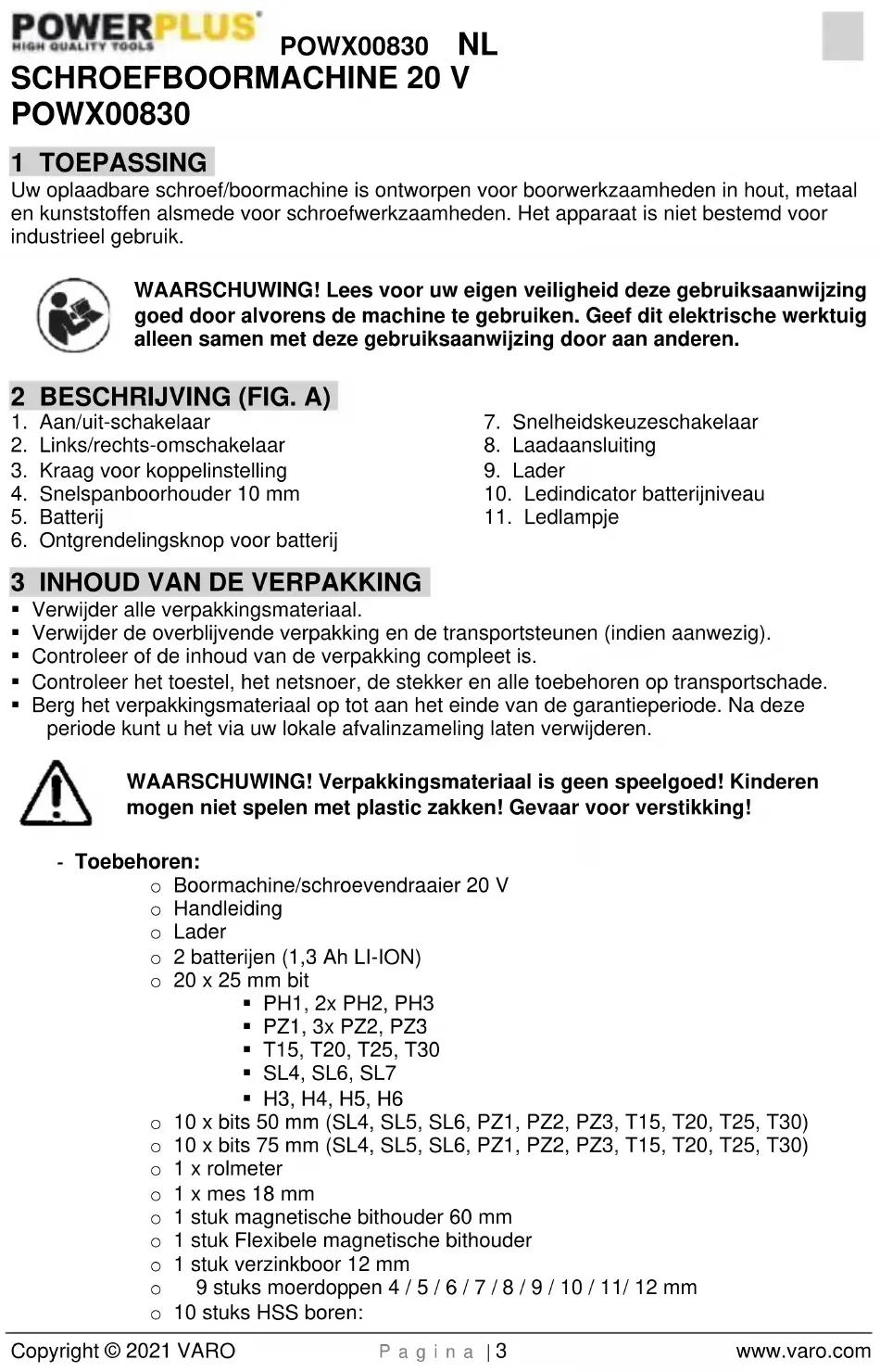 - Uw toestel moet minstens 1x per maand opgeladen worden, opdat de werking van dit toestel optimaal blijft. 15 MILIEU Indien u, na zekere tijd, beslist uw machine te vervangen, werp deze dan niet weg bij uw huishoudelijk afval maar doe dit op een milieuvriendelijke wijze. Het elektrische afval mag niet op dezelfde manier behandeld worden dan het gewone huishoudelijke afval. Breng het naar een recyclagecentrum op plaatsen waar zulke gepaste installaties bestaan. Raadpleeg de plaatselijke instanties of de verkoper voor adviezen over inzameling en verwerking. 16 BATTERIJPACK Dit product bevat Lithium Ion. Recycleer of verwijder de batterijen op een juiste manier om het milieu te sparen. Lokale, regionale of federale wetten kunnen het wegwerpen van Lithium-ion batterijen via het gewone huisvuil verbieden. Neem contact op met uw lokale afvalophaaldienst betreffende de mogelijkheden tot recycleren en/of wegwerpen.POWX00830 NL Copyright © 2021 VARO P a g i n a | 11 www.varo.com 17 CONFORMITEITSVERKLARING VARO N.V. - Vic. Van Rompuy N.V. Joseph Van Instraat 9 - BE2500 Lier - BELGIUM, verklaart dat, Product: Schroefboormachine Handelsmerk: POWERplus Model: POWX00830 voldoet aan de essentiële eisen en aan de overige relevante bepalingen van de van toepassing zijnde Europese Richtlijnen, gebaseerd op de toepassing van Europese geharmoniseerde normen. Elke niet-toegelaten modificatie van het apparaat maakt deze verklaring nietig. Europese Richtlijnen (inclusief, indien van toepassing, hun wijzigingen tot op de datum van ondertekening): 2011/65/EU 2006/42/EC 2014/30/EU Europese geharmoniseerde normen (inclusief, indien van toepassing, hun wijzigingen tot op de datum van ondertekening): EN62841-1 : 2015 EN62841-2-1 : 2018 EN55014-1 : 2017 EN55014-2 : 2015 Beheerder van de technische documentatie: Philippe Vankerkhove, VARO – Vic. Van Rompuy N.V. Ondergetekende handelt in opdracht van de bedrijfsleider, Ludo Mertens Regelgevings- en compliancemanager 23/09/2021, Lier - BelgiumPOWX00830 FR Copyright © 2021 VARO P a g e | 1 www.varo.com 1 UTILISATION ................................................................................... 3