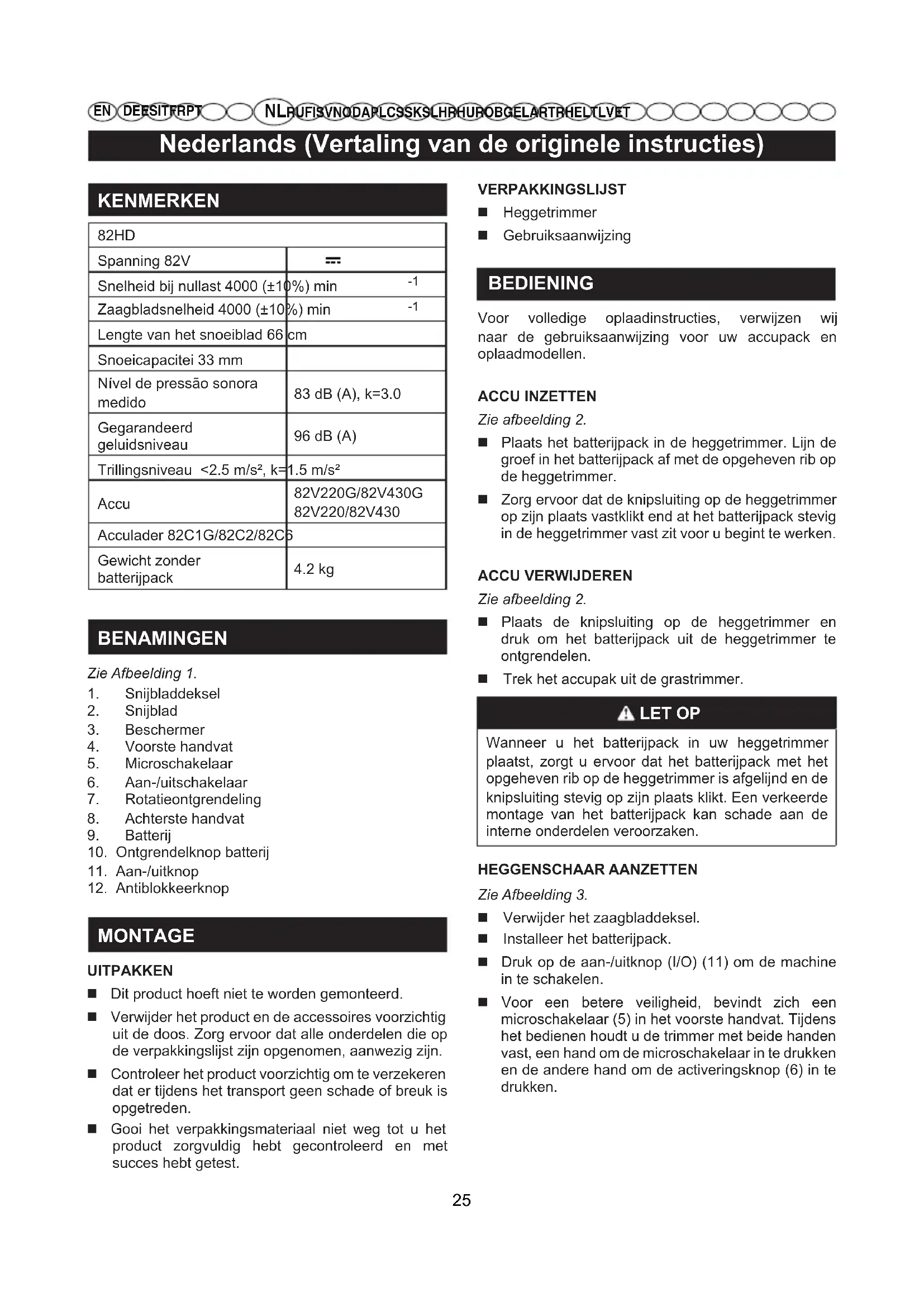 HEGGENSCHAAR WAARSCHUWING Vergeet niet dat accugereedschap altijd startklaar is omdat het niet op een stopcontact hoeft te worden aangesloten. Om ernstig lichamelijk letsel te voorkomen dient u altijd de accu te verwijderen en uiterst waakzaam te blijven bij het onderhoud of de vervanging van het snoeiblad. 26Nederlands (Vertaling van de originele instructies)