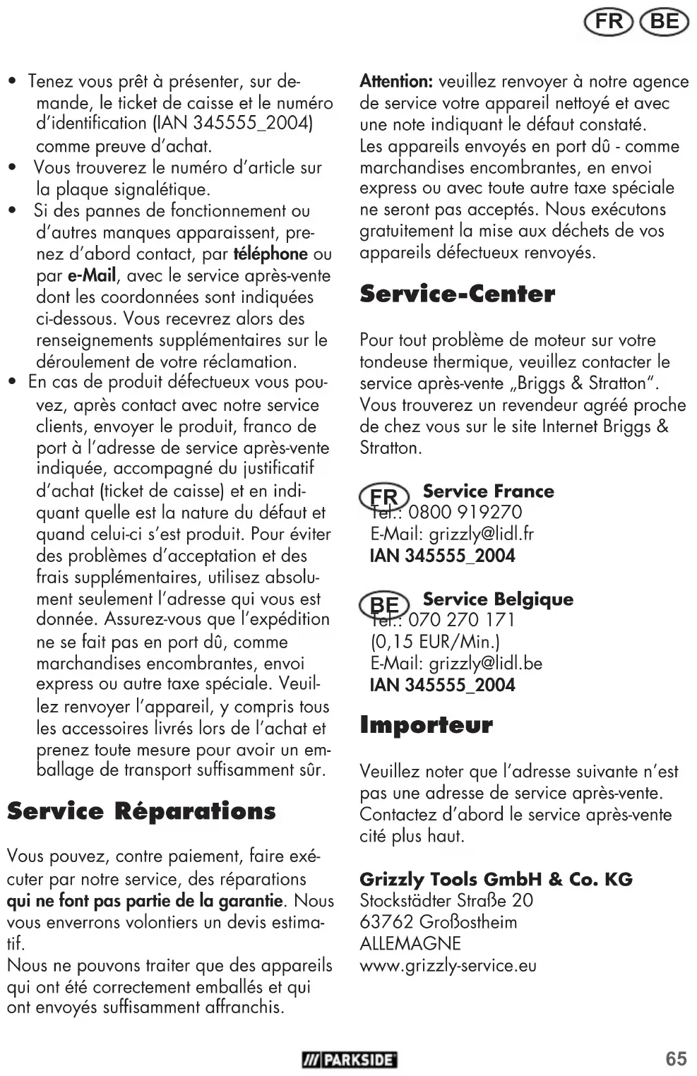 - Service Belgique Tel.: 070 270 171 (0,15 EUR/Min.) E-Mail: grizzly@lidl.be IAN 345555_2004 Importeur Veuillez noter que l’adresse suivante n’est pas une adresse de service après-vente. Contactez d’abord le service après-vente cité plus haut. Grizzly Tools GmbH & Co. KG Stockstädter Straße 20 63762 Großostheim ALLEMAGNE www.grizzly-service.eu66 NL BE Inhoud Inleiding p. 66