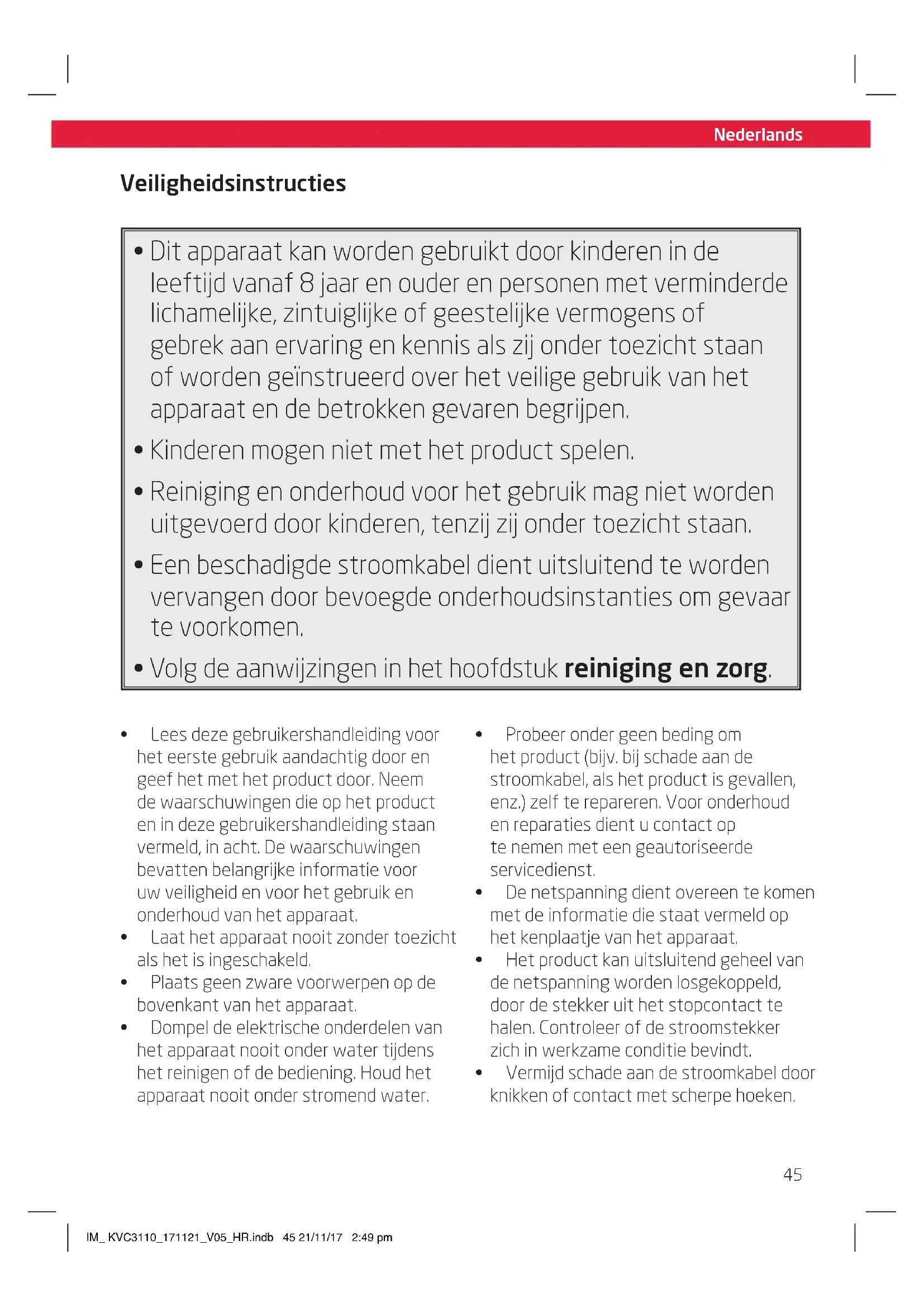 - Vermijd schade aan de stroomkabel door knikken of contact met scherpe hoeken. IM_ KVC3110_171121_V05_HR.indb 45 21/11/17 2:49 pmNederlands