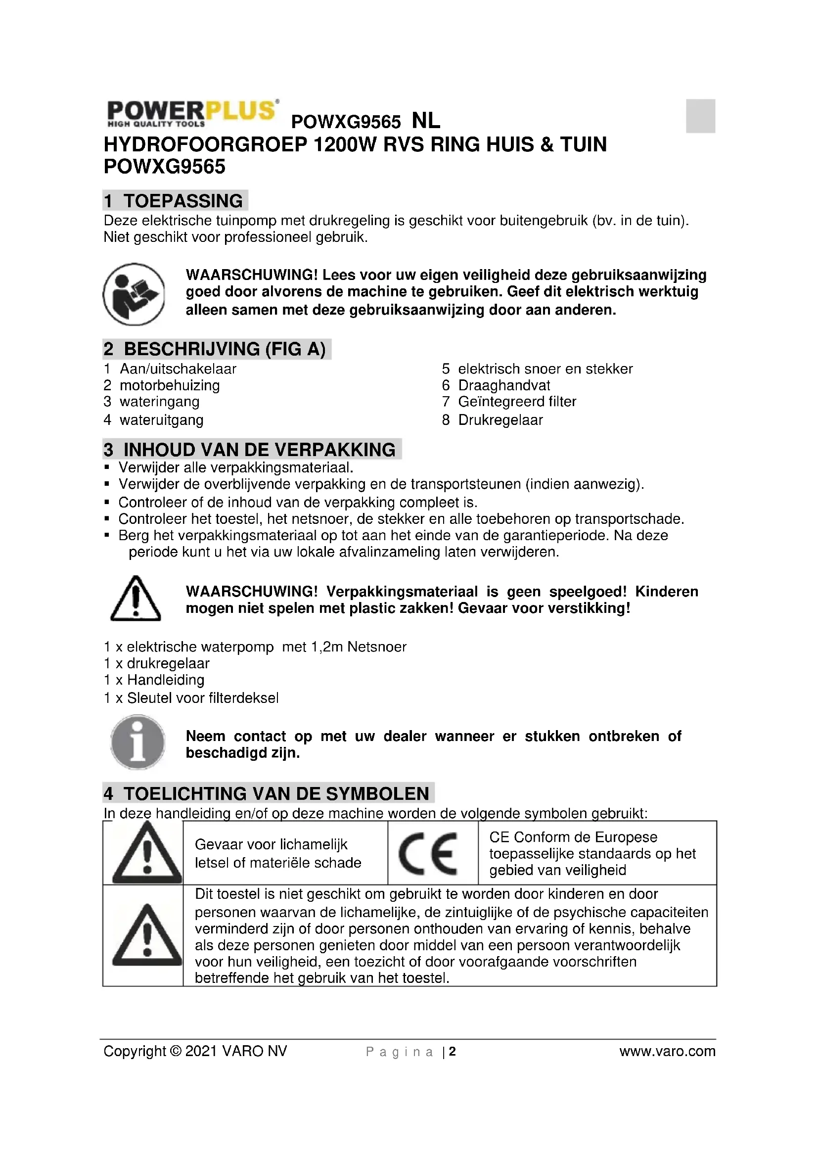 - De pomp mag niet droog draaien. Dit kan leiden tot onherstelbare schade.POWXG9565 NL Copyright © 2021 VARO NV P a g i n a | 5 www.varo.com