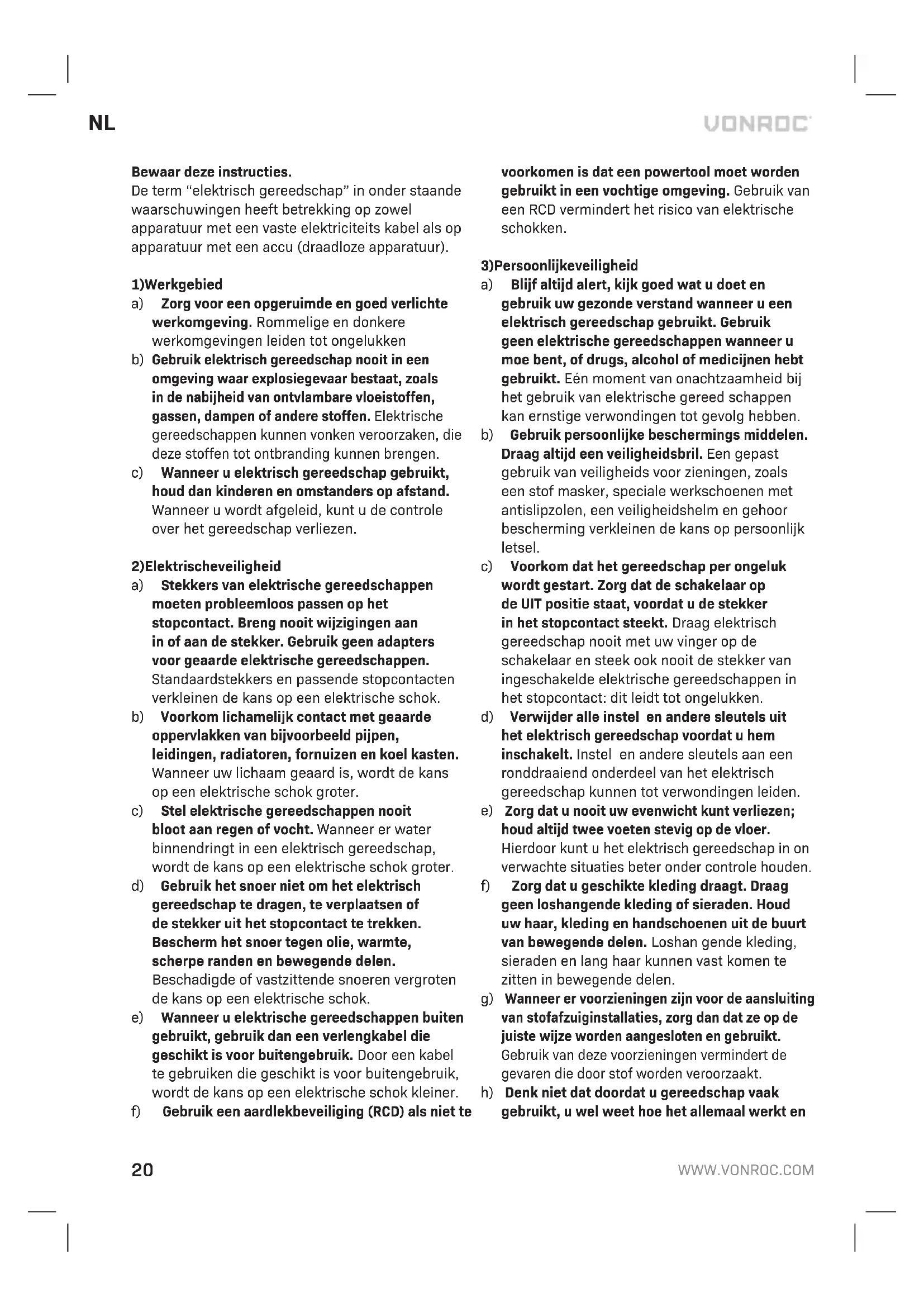 Bewaar deze instructies. De term “elektrisch gereedschap” in onder staande waarschuwingen heeft betrekking op zowel apparatuur met een vaste elektriciteits kabel als op apparatuur met een accu (draadloze apparatuur).