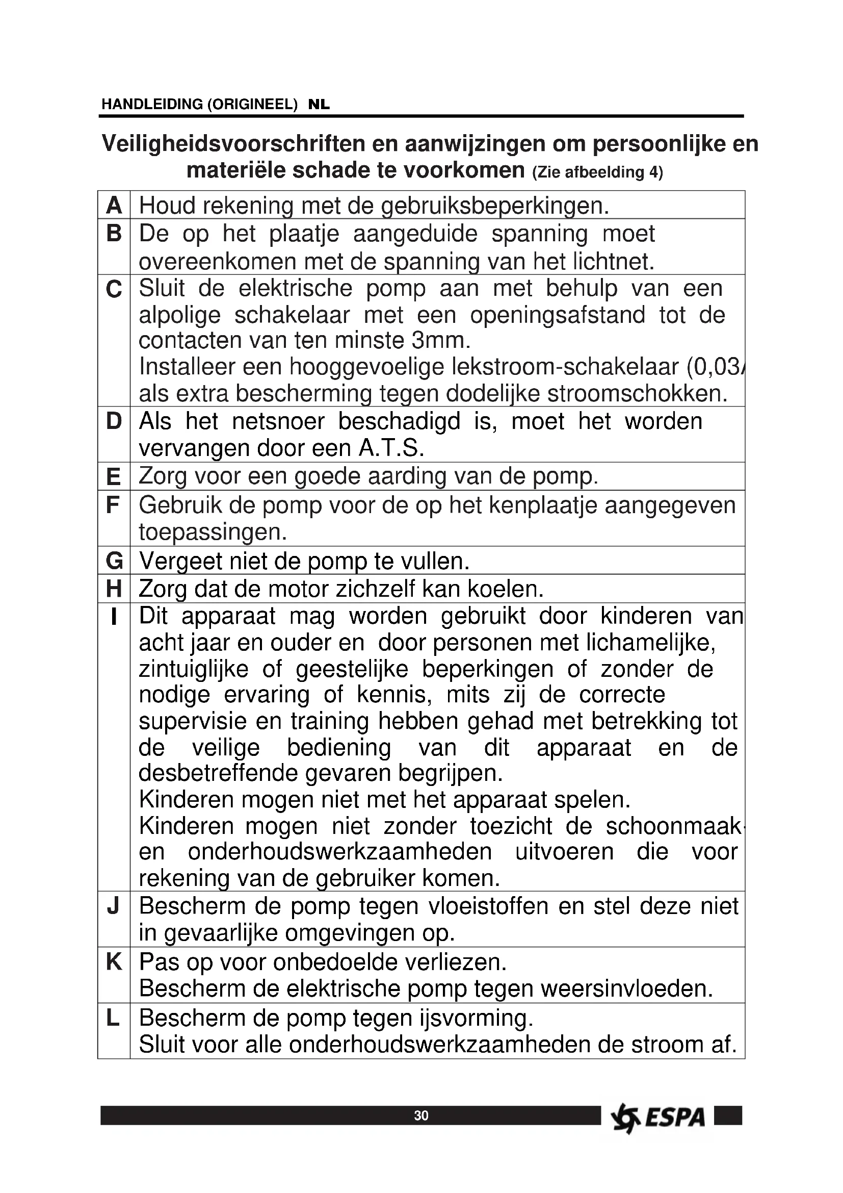 De pomp bevat geen giftige of verontreinigende materialen waar u rekening mee moet houden wanneer u deze ten slotte wilt afdanken. De belangrijkste onderdelen zijn naar behoren gekenmerkt om een gescheiden verwijdering te waarborgen. Dit product, of onderdelen van dit product dienen op een milieuvriendelijke manier afgevoerd te worden, breng het naar het gemeentelijke afvaldepot. Wanneer dit niet mogelijk is, neemt u dan contact op met uw ESPA leverancier.33