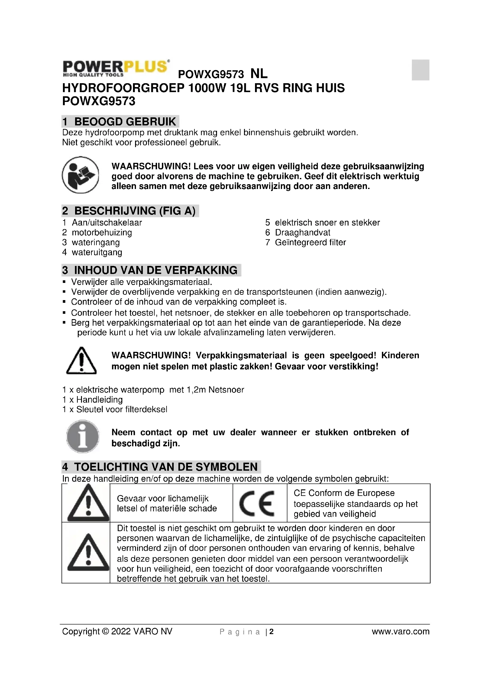 - Uw gereedschap moet als geheel naar uw dealer worden teruggebracht in een aanvaardbare staat van netheid, in zijn originele kunststof koffer (indien van toepassing op het product) en het moet vergezeld zijn van uw bewijs van aankoop.POWXG9573 NL Copyright © 2022 VARO NV P a g i n a | 8 www.varo.com 13 MILIEU Indien u, na zekere tijd, beslist uw machine te vervangen, werp deze dan niet weg bij uw huishoudelijk afval maar doe dit op een milieuvriendelijke wijze. Het elektrische afval mag niet op dezelfde manier behandeld worden dan het gewone huishoudelijke afval. Breng het naar een recyclagecentrum op plaatsen waar zulke gepaste installaties bestaan. Raadpleeg de plaatselijke instanties of de verkoper voor adviezen over inzameling en verwerking. 14 CONFORMITEITSVERKLARING VARO N.V. - Vic. Van Rompuy N.V. Joseph Van Instraat 9 - BE2500 Lier - BELGIUM, verklaart dat, Product: Hydrofoorgroep 1000W 19l Rvs Ring Huis Handelsmerk: POWERplus Model: POWXG9573 voldoet aan de essentiële eisen en aan de overige relevante bepalingen van de van toepassing zijnde Europese Richtlijnen, gebaseerd op de toepassing van Europese geharmoniseerde normen. Elke niet-toegelaten modificatie van het apparaat maakt deze verklaring nietig. Europese Richtlijnen (inclusief, indien van toepassing, hun wijzigingen tot op de datum van ondertekening): 2011/65/EU 2014/35/EU 2014/30/EU 2014/68/EU 2000/14/EC Annex V LwA Measured 82dB(A) Guaranteed 84dB(A) Europese geharmoniseerde normen (inclusief, indien van toepassing, hun wijzigingen tot op de datum van ondertekening): EN60335-1 : 2012 EN60335-2-41 : 2003