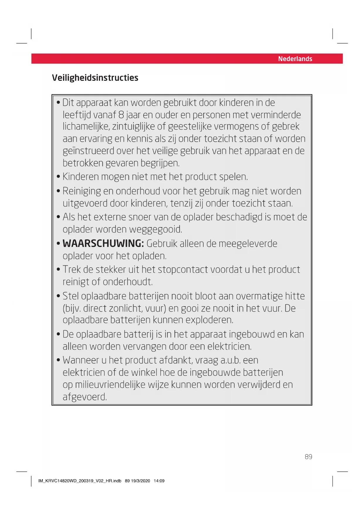 - Wanneer u het product afdankt, vraag a.u.b. een elektricien of de winkel hoe de ingebouwde batterijen op milieuvriendelijke wijze kunnen worden verwijderd en afgevoerd. IM_KRVC14820WD_200319_V02_HR.indb 89 19/3/2020 14:09Nederlands