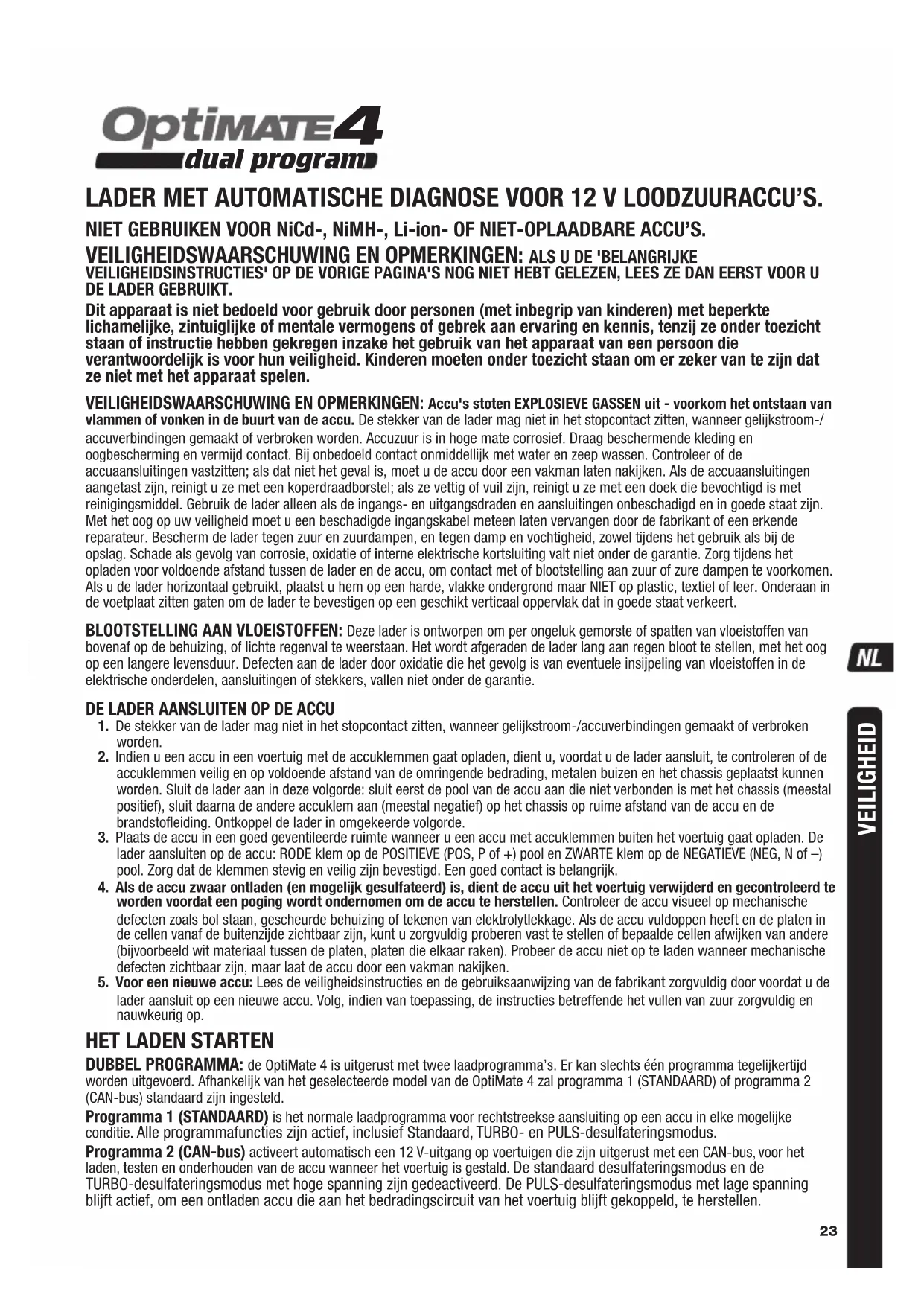 dual program LADER MET AUTOMATISCHE DIAGNOSE VOOR 12 V LOODZUURACCU’S. NIET GEBRUIKEN VOOR NiCd-, NiMH-, Li-ion- OF NIET-OPLAADBARE ACCU’S. VEILIGHEIDSWAARSCHUWING EN OPMERKINGEN: ALS U DE 'BELANGRIJKE VEILIGHEIDSINSTRUCTIES' OP DE VORIGE PAGINA'S NOG NIET HEBT GELEZEN, LEES ZE DAN EERST VOOR U DE LADER GEBRUIKT. Dit apparaat is niet bedoeld voor gebruik door personen (met inbegrip van kinderen) met beperkte lichamelijke, zintuiglijke of mentale vermogens of gebrek aan ervaring en kennis, tenzij ze onder toezicht staan of instructie hebben gekregen inzake het gebruik van het apparaat van een persoon die verantwoordelijk is voor hun veiligheid. Kinderen moeten onder toezicht staan om er zeker van te zijn dat ze niet met het apparaat spelen. VEILIGHEIDSWAARSCHUWING EN OPMERKINGEN: Accu's stoten EXPLOSIEVE GASSEN uit - voorkom het ontstaan van vlammen of vonken in de buurt van de accu. De stekker van de lader mag niet in het stopcontact zitten, wanneer gelijkstroom-/ accuverbindingen gemaakt of verbroken worden. Accuzuur is in hoge mate corrosief. Draag beschermende kleding en oogbescherming en vermijd contact. Bij onbedoeld contact onmiddellijk met water en zeep wassen. Controleer of de accuaansluitingen vastzitten; als dat niet het geval is, moet u de accu door een vakman laten nakijken. Als de accuaansluitingen aangetast zijn, reinigt u ze met een koperdraadborstel; als ze vettig of vuil zijn, reinigt u ze met een doek die bevochtigd is met reinigingsmiddel. Gebruik de lader alleen als de ingangs- en uitgangsdraden en aansluitingen onbeschadigd en in goede staat zijn. Met het oog op uw veiligheid moet u een beschadigde ingangskabel meteen laten vervangen door de fabrikant of een erkende reparateur. Bescherm de lader tegen zuur en zuurdampen, en tegen damp en vochtigheid, zowel tijdens het gebruik als bij de opslag. Schade als gevolg van corrosie, oxidatie of interne elektrische kortsluiting valt niet onder de garantie. Zorg tijdens het opladen voor voldoende afstand tussen de lader en de accu, om contact met of blootstelling aan zuur of zure dampen te voorkomen. Als u de lader horizontaal gebruikt, plaatst u hem op een harde, vlakke ondergrond maar NIET op plastic, textiel of leer. Onderaan in de voetplaat zitten gaten om de lader te bevestigen op een geschikt verticaal oppervlak dat in goede staat verkeert. BLOOTSTELLING AAN VLOEISTOFFEN: Deze lader is ontworpen om per ongeluk gemorste of spatten van vloeistoffen van bovenaf op de behuizing, of lichte regenval te weerstaan. Het wordt afgeraden de lader lang aan regen bloot te stellen, met het oog op een langere levensduur. Defecten aan de lader door oxidatie die het gevolg is van eventuele insijpeling van vloeistoffen in de elektrische onderdelen, aansluitingen of stekkers, vallen niet onder de garantie.DE LADER AANSLUITEN OP DE ACCU 1. De stekker van de lader mag niet in het stopcontact zitten, wanneer gelijkstroom-/accuverbindingen gemaakt of verbroken worden. 2. Indien u een accu in een voertuig met de accuklemmen gaat opladen, dient u, voordat u de lader aansluit, te controleren of de accuklemmen veilig en op voldoende afstand van de omringende bedrading, metalen buizen en het chassis geplaatst kunnen worden. Sluit de lader aan in deze volgorde: sluit eerst de pool van de accu aan die niet verbonden is met het chassis (meestal positief), sluit daarna de andere accuklem aan (meestal negatief) op het chassis op ruime afstand van de accu en de brandstofleiding. Ontkoppel de lader in omgekeerde volgorde. 3. Plaats de accu in een goed geventileerde ruimte wanneer u een accu met accuklemmen buiten het voertuig gaat opladen. De lader aansluiten op de accu: RODE klem op de POSITIEVE (POS, P of +) pool en ZWARTE klem op de NEGATIEVE (NEG, N of –) pool. Zorg dat de klemmen stevig en veilig zijn bevestigd. Een goed contact is belangrijk. 4. Als de accu zwaar ontladen (en mogelijk gesulfateerd) is, dient de accu uit het voertuig verwijderd en gecontroleerd te worden voordat een poging wordt ondernomen om de accu te herstellen. Controleer de accu visueel op mechanische defecten zoals bol staan, gescheurde behuizing of tekenen van elektrolytlekkage. Als de accu vuldoppen heeft en de platen in de cellen vanaf de buitenzijde zichtbaar zijn, kunt u zorgvuldig proberen vast te stellen of bepaalde cellen afwijken van andere (bijvoorbeeld wit materiaal tussen de platen, platen die elkaar raken). Probeer de accu niet op te laden wanneer mechanische defecten zichtbaar zijn, maar laat de accu door een vakman nakijken. 5. Voor een nieuwe accu: Lees de veiligheidsinstructies en de gebruiksaanwijzing van de fabrikant zorgvuldig door voordat u de lader aansluit op een nieuwe accu. Volg, indien van toepassing, de instructies betreffende het vullen van zuur zorgvuldig en nauwkeurig op.