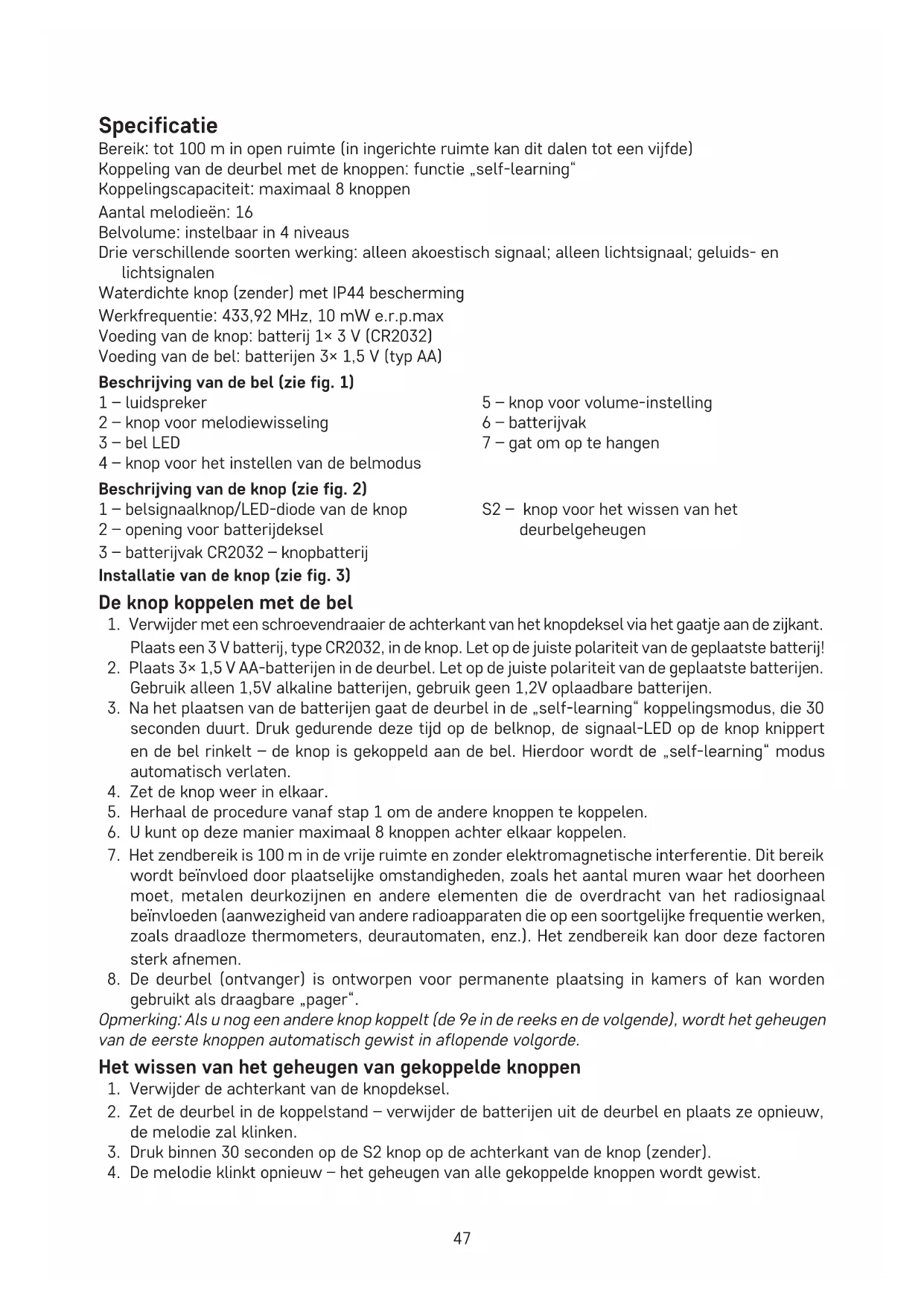 - Controleer af en toe de werking van de deurbel en vervang tijdig de batterijen. Gebruik alleen 1,5V alkaline batterijen van hoge kwaliteit met de voorgeschreven parameters.