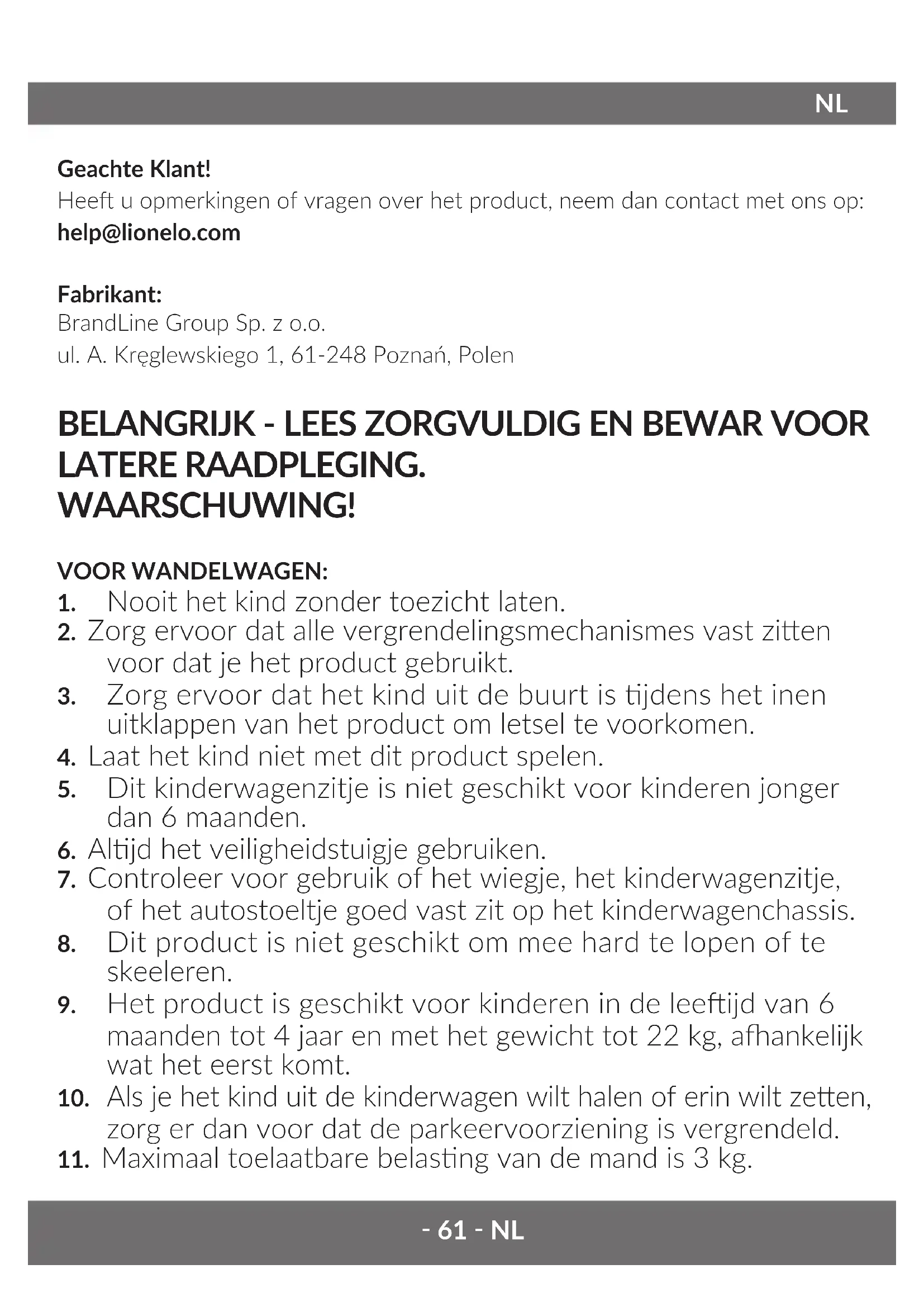 BELANGRIJK — Lees de gebruiksaanwijzing zorgvuldig door en bewaar deze voor later gebruik WAARSCHUWING! VOOR WIEG