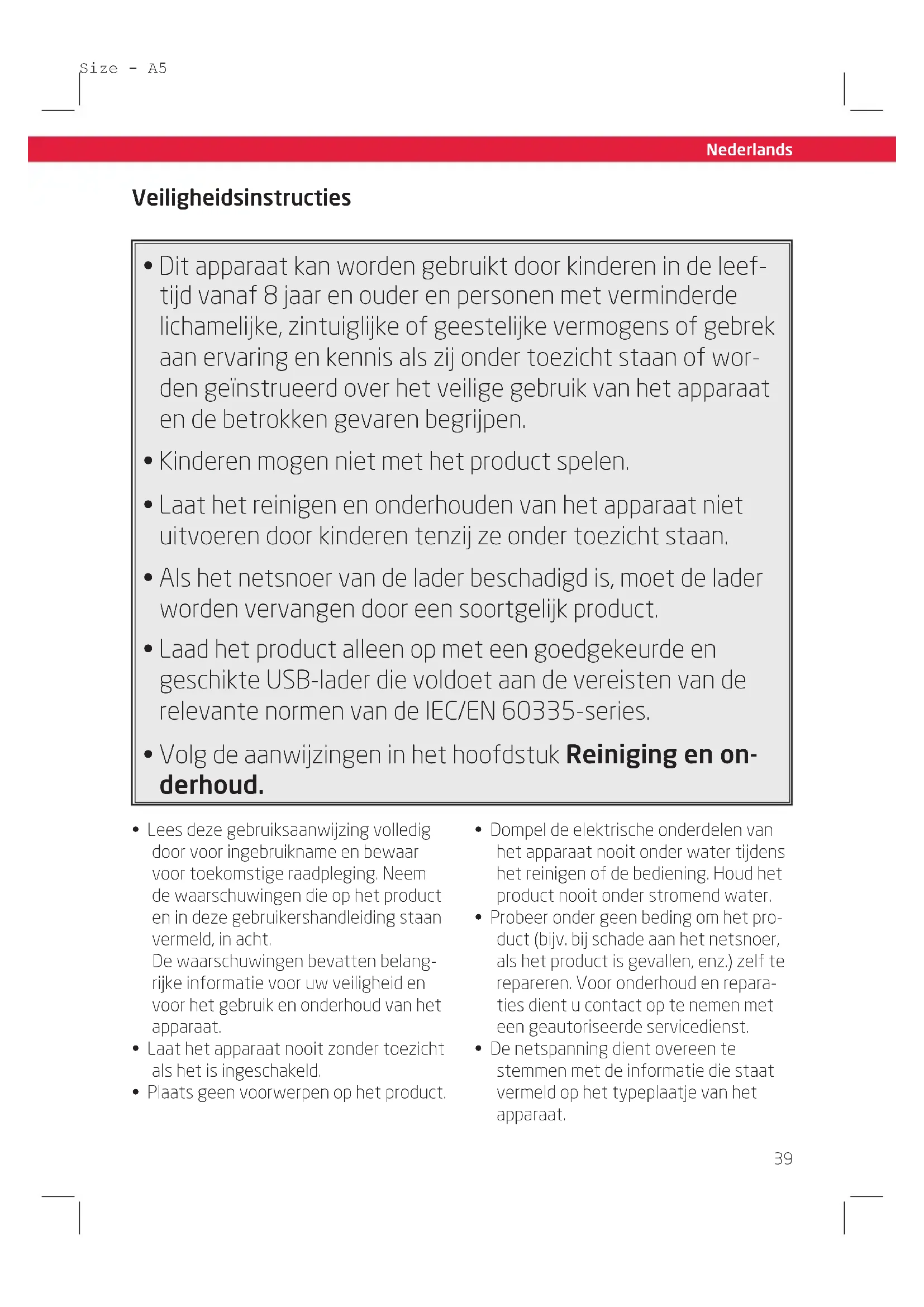 - De netspanning dient overeen te stemmen met de informatie die staat vermeld op het typeplaatje van het apparaat.40 Nederlands Size - A5 Size - A5 Veiligheidsinstructies