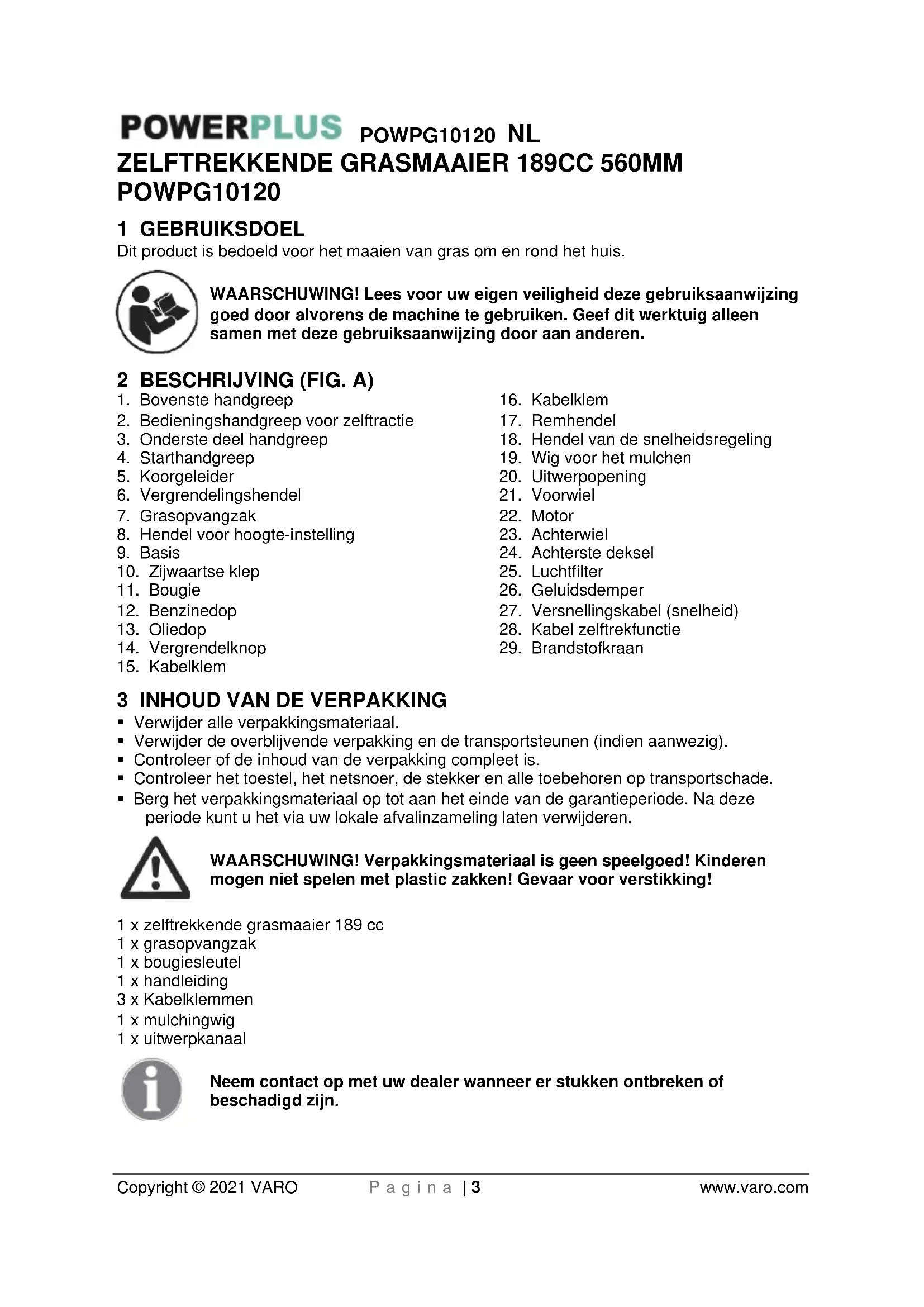 - Berg het verpakkingsmateriaal op tot aan het einde van de garantieperiode. Na deze periode kunt u het via uw lokale afvalinzameling laten verwijderen. WAARSCHUWING! Verpakkingsmateriaal is geen speelgoed! Kinderen mogen niet spelen met plastic zakken! Gevaar voor verstikking! 1 x zelftrekkende grasmaaier 189 cc 1 x grasopvangzak 1 x bougiesleutel 1 x handleiding 3 x Kabelklemmen 1 x mulchingwig 1 x uitwerpkanaal Neem contact op met uw dealer wanneer er stukken ontbreken of beschadigd zijn.POWPG10120 NL Copyright © 2021 VARO P a g i n a | 4 www.varo.com