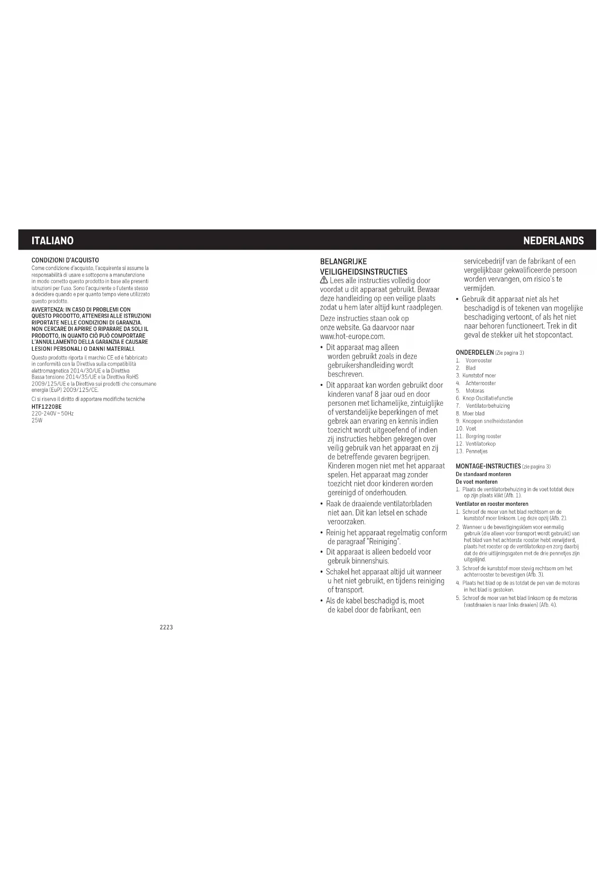 - Bewaar het apparaat op een koele, droge plaats. Dek het af om het tegen stof te beschermen. VERWIJDERING Dit apparaat voldoet aan EU-richtlijn 2012/19/EG met betrekking tot AEEA (afgedankte elektrische en elektronische apparatuur). Producten waarbij een doorgekruiste verrijdbare afvalbak staat aangegeven, op het typeplaatje, de verpakking of de gebruikershandleiding, moeten aan het einde van hun levensduur apart worden ingezameld. Het is NIET toegestaan om ze bij het normale huisvuil te doen. Informatie over inzamelpunten kunt u bij uw gemeente opvragen. Bij vervanging van apparatuur door een nieuwer exemplaar is de leverancier ook verplicht het oude model terug te nemen om het op de juiste manier voor recycling aan te bieden. GARANTIE Lees alle instructies voordat u dit apparaat gebruikt. Bewaar de kassabon als bewijs en datum van aankoop. De kassabon moet worden getoond bij claims binnen de relevante garantieperiode. Alle claims onder garantie zijn ongeldig zonder bewijs van aankoop. Uw apparaat wordt geleverd met een garantie van drie jaar (3 jaar) vanaf de aankoopdatum. Onder deze garantie vallen defecten in materiaal of vakmanschap die zich bij normaal gebruik voordoen; defecte apparaten die aan deze criteria voldoen, worden gratis vervangen. De garantie dekt GEEN defecten of schade als gevolg van misbruik of het niet volgen van de gebruikersinstructies. De garantie vervalt als het apparaat wordt geopend, als ermee wordt geknoeid, als het wordt gebruikt met andere dan de originele onderdelen of accessoires, of als er reparaties door niet-geautoriseerde personen worden uitgevoerd. Accessoires en verbruiksartikelen vallen buiten de garantie. Ga voor vragen over service naar www.hot-europe.com/support of raadpleeg de contactgegevens achterin deze gebruiksaanwijzing. Deze garantie is uitsluitend van toepassing op Europa, Rusland, het MiddenOosten en Afrika. NEDERLANDS