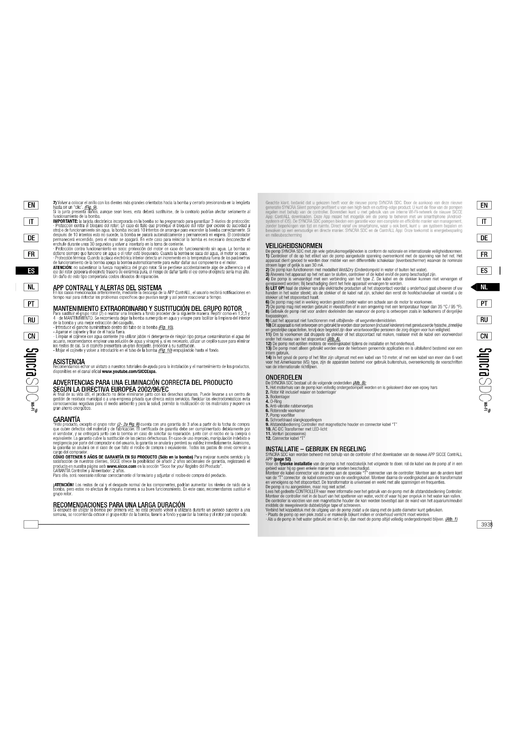 Si después de utilizar la bomba por primera vez, no está previsto volver a utilizarla durante un periodo superior a una semana, se recomienda extraer el grupo rotor de la bomba, lavarlo a fondo y guardar la bomba y el rotor por separado. Geachte klant, bedankt dat u gekozen heeft voor de nieuwe pomp SYNCRA SDC. Door de aankoop van deze nieuwe generatie SYNCRA Silent pompen profiteert u van een high-tech en cutting-edge product. U kunt de flow van de pompen regelen met behulp van de controller. Bovendien kunt u met gebruik van uw interne Wi-Fi-netwerk de nieuwe SICCE App: ContrALL downloaden. Deze App maakt het mogelijk om de pomp te beheren met uw smarthphone (Android- systeem of iOS). De SYNCRA SDC pompen bieden een garantie voor een complete en efficiënte manier van management, zonder beperkingen van tijd en ruimte. Direct vanaf uw smartphone, waar u ook bent, kunt u uw systeem bepalen en bewaken op een eenvoudige en directe manier. SYNCRA SDC en de ContrALL App: Onze toekomst is energiebesparing en milieubescherming VEILIGHEIDSNORMEN De pomp SYNCRA SDC met zijn vele gebruiksmogelijkheden is conform de nationale en internationale veiligheidsnormen.