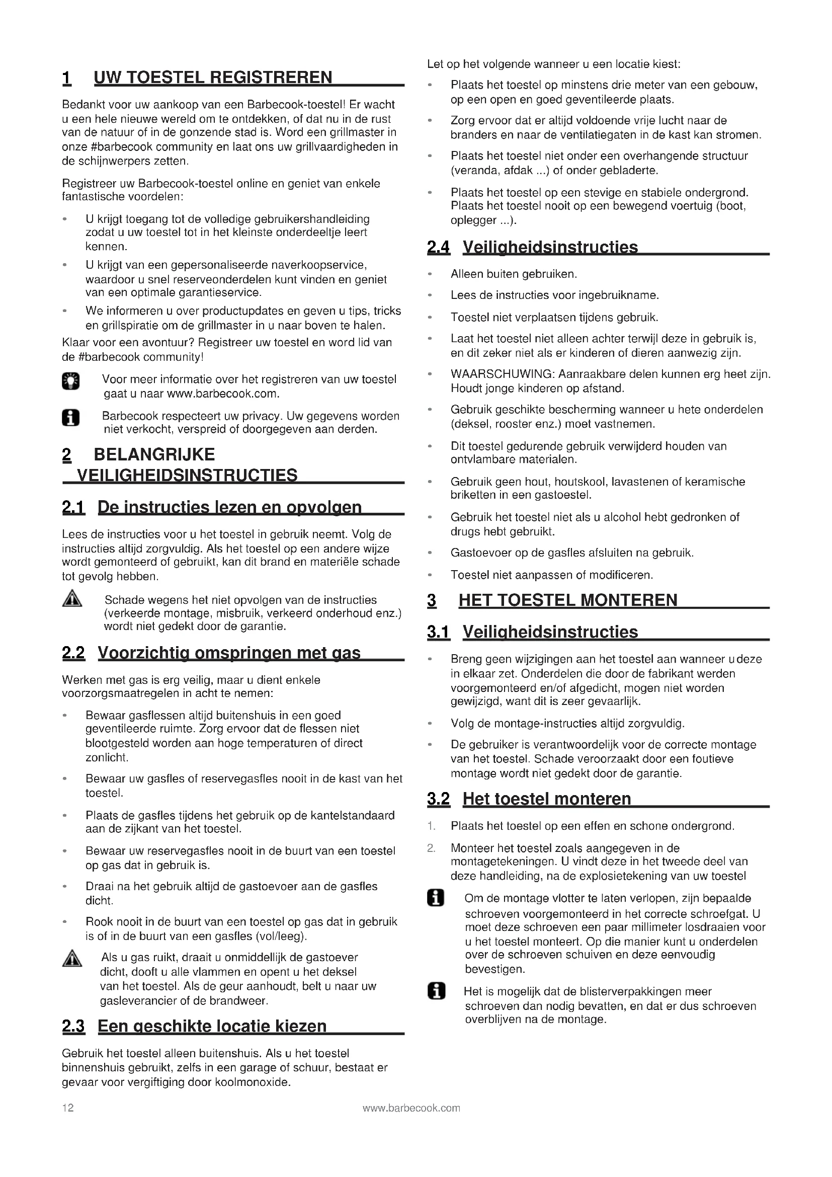 Monteer het toestel zoals aangegeven in de montagetekeningen. U vindt deze in het tweede deel van deze handleiding, na de explosietekening van uw toestel Om de montage vlotter te laten verlopen, zijn bepaalde schroeven voorgemonteerd in het correcte schroefgat. U moet deze schroeven een paar millimeter losdraaien voor u het toestel monteert. Op die manier kunt u onderdelen over de schroeven schuiven en deze eenvoudig bevestigen. Het is mogelijk dat de blisterverpakkingen meer schroeven dan nodig bevatten, en dat er dus schroeven overblijven na de montage.www.barbecook.com