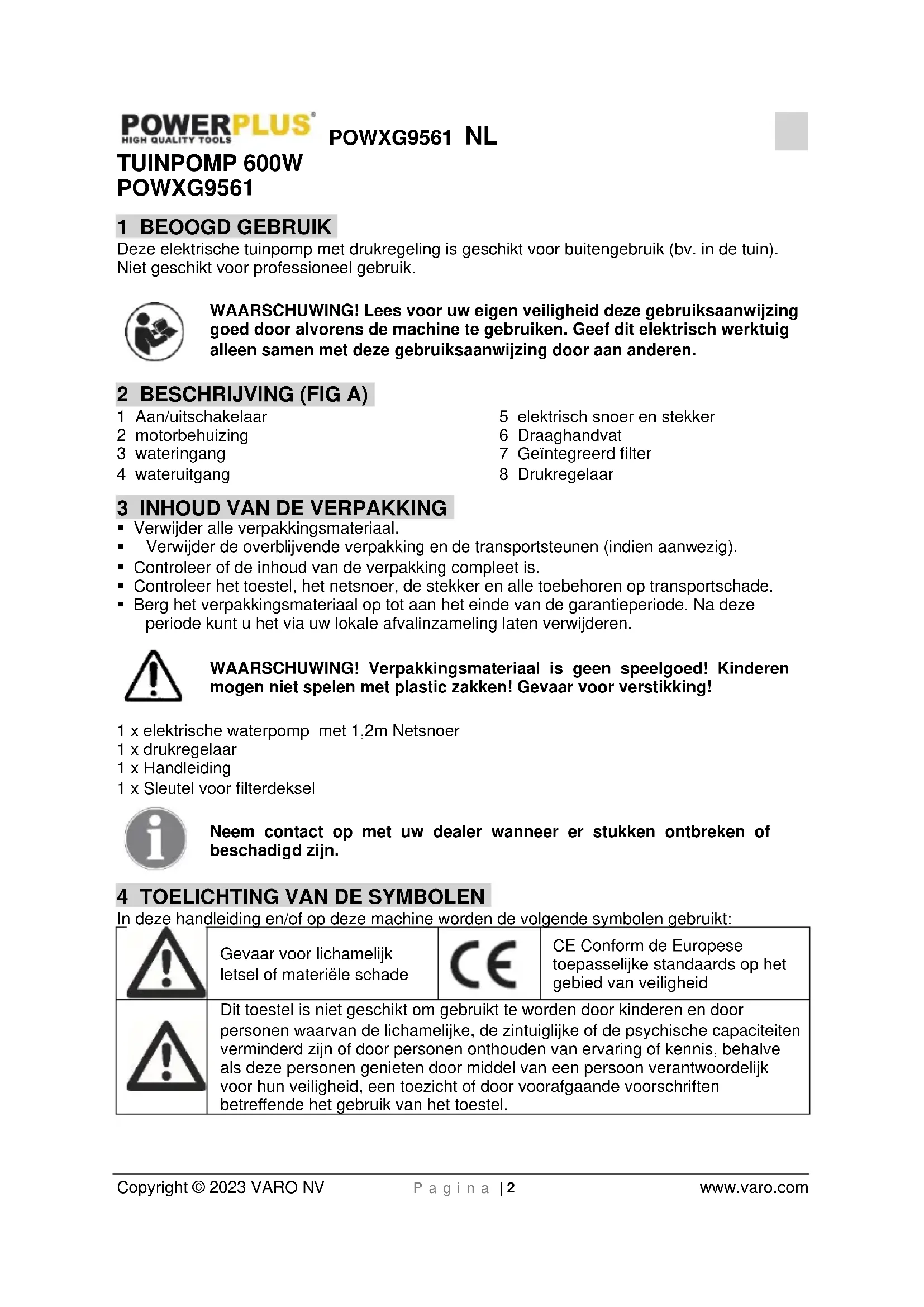 Copyright © 2023 VARO NV P a g i n a | 2 www.varo.com TUINPOMP 600W POWXG9561 1 BEOOGD GEBRUIK Deze elektrische tuinpomp met drukregeling is geschikt voor buitengebruik (bv. in de tuin). Niet geschikt voor professioneel gebruik. WAARSCHUWING! Lees voor uw eigen veiligheid deze gebruiksaanwijzing goed door alvorens de machine te gebruiken. Geef dit elektrisch werktuig alleen samen met deze gebruiksaanwijzing door aan anderen. 2 BESCHRIJVING (FIG A) 1 Aan/uitschakelaar 2 motorbehuizing 3 wateringang 4 wateruitgang 5 elektrisch snoer en stekker 6 Draaghandvat 7 Geïntegreerd filter 8 Drukregelaar