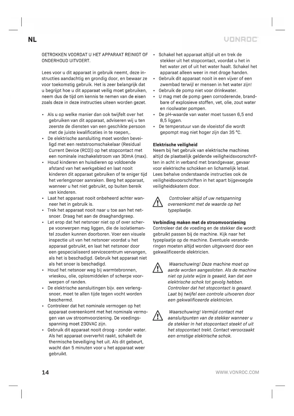 - De temperatuur van de vloeistof die wordt gepompt mag niet hoger zijn dan 35 °C. Elektrische veiligheid Neem bij het gebruik van elektrische machines altijd de plaatselijk geldende veiligheidsvoorschrif- ten in acht in verband met brandgevaar, gevaar voor elektrische schokken en lichamelijk letsel. Lees behalve onderstaande instructies ook de veiligheidsvoorschriften in het apart bijgevoegde veiligheidskatern door. Controleer altijd of uw netspanning overeenkomt met de waarde op het typeplaatje. Verbinding maken met de stroomvoorziening Controleer dat de voeding en de stekker die wordt gebruikt passen bij de machine. Kijk naar het typeplaatje op de machine. Eventuele verande- ringen moeten altijd worden uitgevoerd door een gekwalificeerde elektricien. Waarschuwing! Deze machine moet op aarde worden aangesloten. Als de machine niet op juiste wijze is geaaid, kan dat een elektrische schok tot gevolg hebben. Controleer dat het stopcontact is geaard. Laat bij twijfel een controle uitvoeren door een gekwalificeerde elektricien. Waarschuwing! Vermijd contact met aansluitpunten van de stekker wanneer u de stekker in het stopcontact steekt of uit het stopcontact trekt. Contact veroorzaakt een ernstige elektrische schok.NL