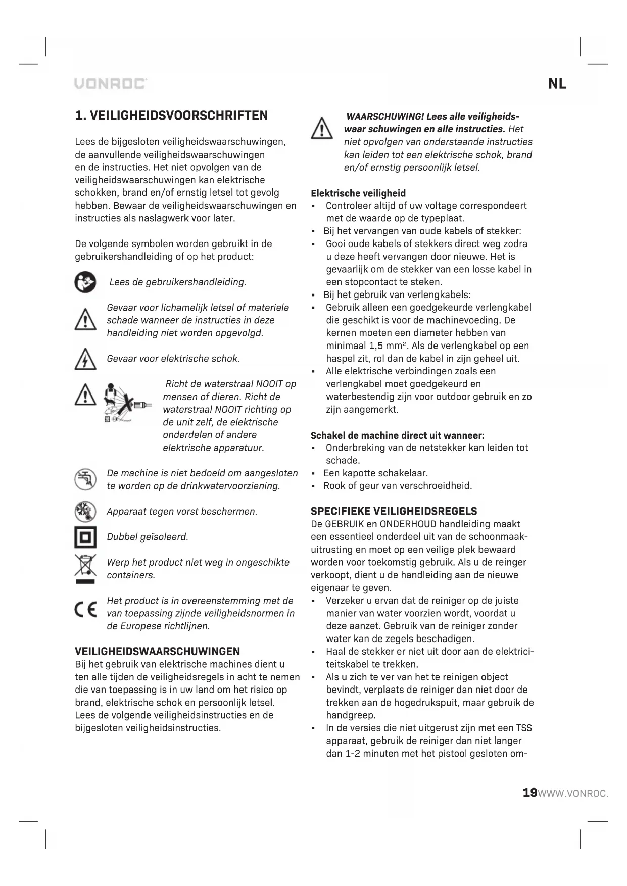 Lees de bijgesloten veiligheidswaarschuwingen, de aanvullende veiligheidswaarschuwingen en de instructies. Het niet opvolgen van de veiligheidswaarschuwingen kan elektrische schokken, brand en/of ernstig letsel tot gevolg hebben. Bewaar de veiligheidswaarschuwingen en instructies als naslagwerk voor later. De volgende symbolen worden gebruikt in de gebruikershandleiding of op het product: Lees de gebruikershandleiding. Gevaar voor lichamelijk letsel of materiele schade wanneer de instructies in deze handleiding niet worden opgevolgd. Gevaar voor elektrische schok. Richt de waterstraal NOOIT op mensen of dieren. Richt de waterstraal NOOIT richting op de unit zelf, de elektrische onderdelen of andere elektrische apparatuur. De machine is niet bedoeld om aangesloten te worden op de drinkwatervoorziening. Apparaat tegen vorst beschermen. Dubbel geïsoleerd. Werp het product niet weg in ongeschikte containers. Het product is in overeenstemming met de van toepassing zijnde veiligheidsnormen in de Europese richtlijnen. VEILIGHEIDSWAARSCHUWINGEN Bij het gebruik van elektrische machines dient u ten alle tijden de veiligheidsregels in acht te nemen die van toepassing is in uw land om het risico op brand, elektrische schok en persoonlijk letsel. Lees de volgende veiligheidsinstructies en de bijgesloten veiligheidsinstructies. WAARSCHUWING! Lees alle veiligheids- waar schuwingen en alle instructies. Het niet opvolgen van onderstaande instructies kan leiden tot een elektrische schok, brand en/of ernstig persoonlijk letsel. Elektrische veiligheid