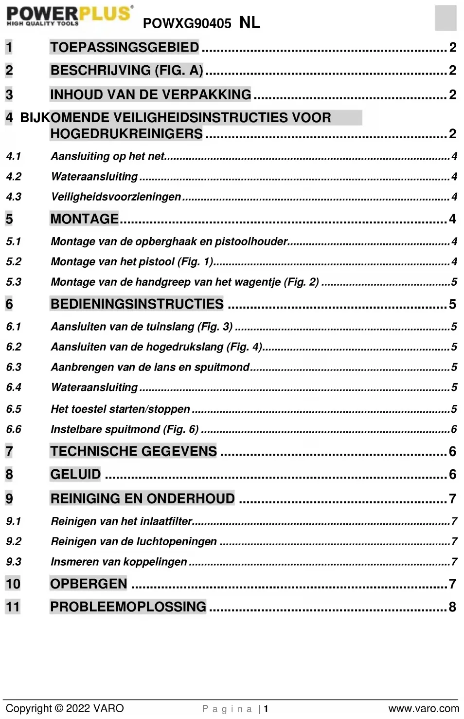 - Hogedrukreinigers mogen niet door kinderen of niet-opgeleide personen gebruikt worden.POWXG90405 NL Copyright © 2022 VARO P a g i n a | 3 www.varo.com