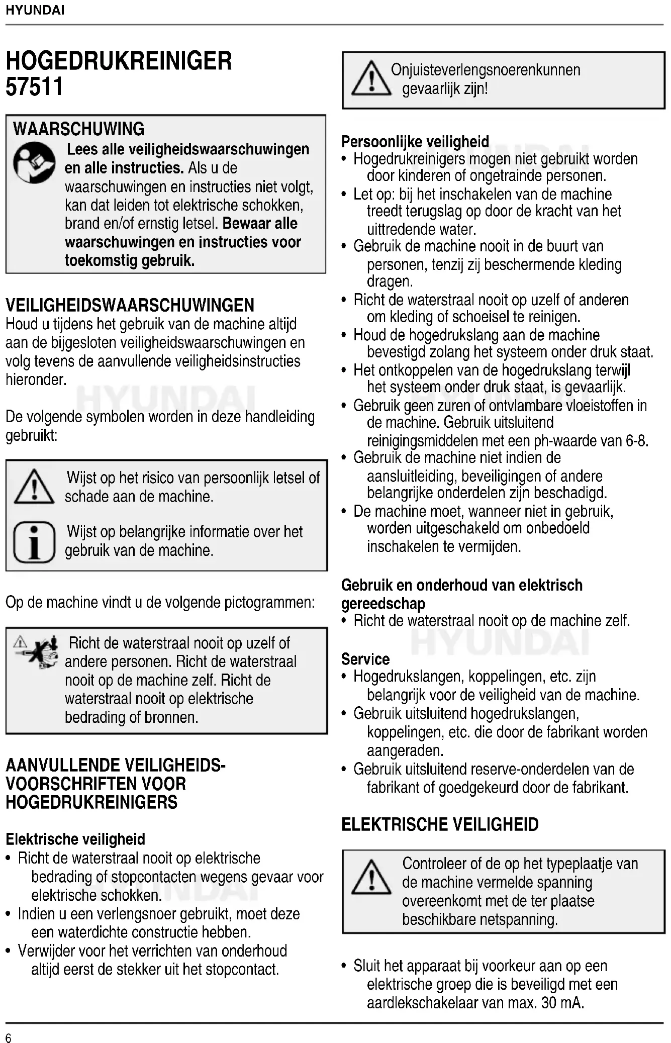 WAARSCHUWING Lees alle veiligheidswaarschuwingen en alle instructies. Als u de waarschuwingen en instructies niet volgt, kan dat leiden tot elektrische schokken, brand en/of ernstig letsel. Bewaar alle waarschuwingen en instructies voor toekomstig gebruik. VEILIGHEIDSWAARSCHUWINGEN Houd u tijdens het gebruik van de machine altijd aan de bijgesloten veiligheidswaarschuwingen en volg tevens de aanvullende veiligheidsinstructies hieronder. De volgende symbolen worden in deze handleiding gebruikt: Wijst op het risico van persoonlijk letsel of schade aan de machine. Wijst op belangrijke informatie over het gebruik van de machine. Op de machine vindt u de volgende pictogrammen: Richt de waterstraal nooit op uzelf of andere personen. Richt de waterstraal nooit op de machine zelf. Richt de waterstraal nooit op elektrische bedrading of bronnen. AANVULLENDE VEILIGHEIDS- VOORSCHRIFTEN VOOR HOGEDRUKREINIGERS Elektrische veiligheid
